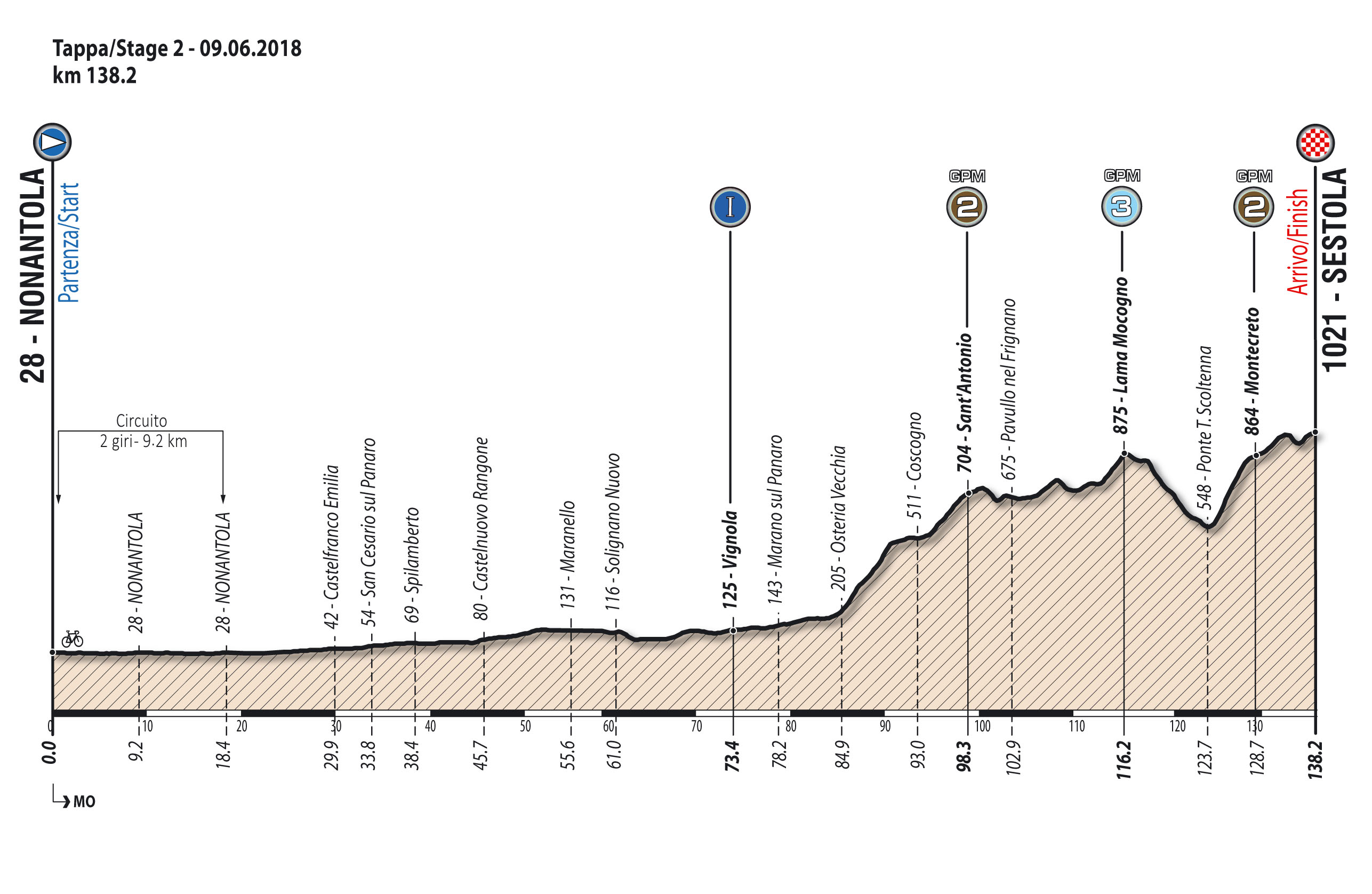 Si prosegue sabato 9 giugno con la seconda tappa del Giro d’Italia Giovani Under 23, totalmente pianeggiante nella prima parte, decisamente più impegnativa nella seconda. Partenza alle 11.35 dalle Cantine Giacobazzi, via ufficiale alle 11.40. Pianeggianti i primi 70 km, fino all’Intergiro di Vignola, poi a Marano sul Panaro si comincia a salire verso il Gran premio della montagna di 2acategoria di Sant’Antonio (704m slm, al km 98,3). Altri GPM al km 116,2 (Lama Mocogno, 3a categoria, 842m slm) e al km 128,7 (Montecreto, 864m slm), a meno di dieci chilometri dal traguardo. Nell’ultimo chilometro e mezzo si sale con pendenze attorno al 4-6%, che si attenuano nel rettilineo conclusivo fino agli ultimi 100 metri totalmente pianeggianti.