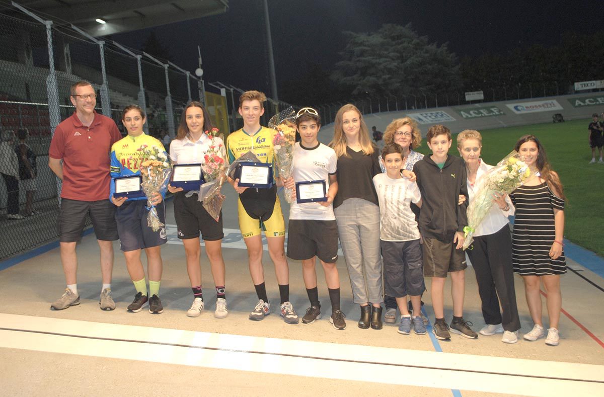 FIORENZUOLA D’ARDA (PC) – Al Velodromo “Attilio Pavesi” di Fiorenzuola è andata in scena stasera la prima gara della stagione 2018, il Gp Pavinord – 1° Memorial Emilio Ferrari, per Esordienti e Allievi (uomini e donne), che prevedeva gare omnium di tre specialità ciascuna: scratch, tempo race e corsa a punti (nella foto tutti i vincitori insieme alla famiglia Ferrari).