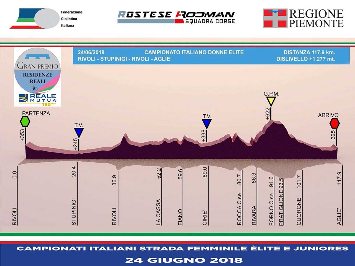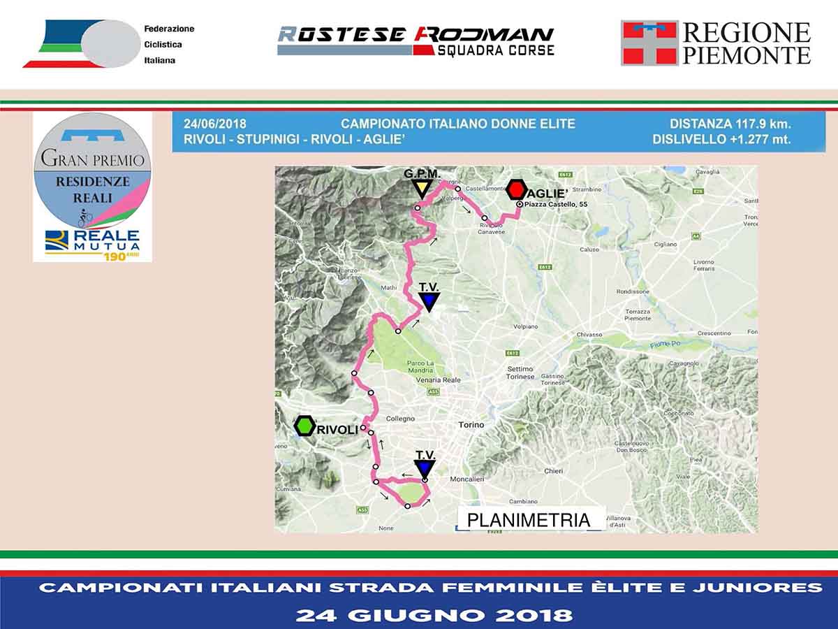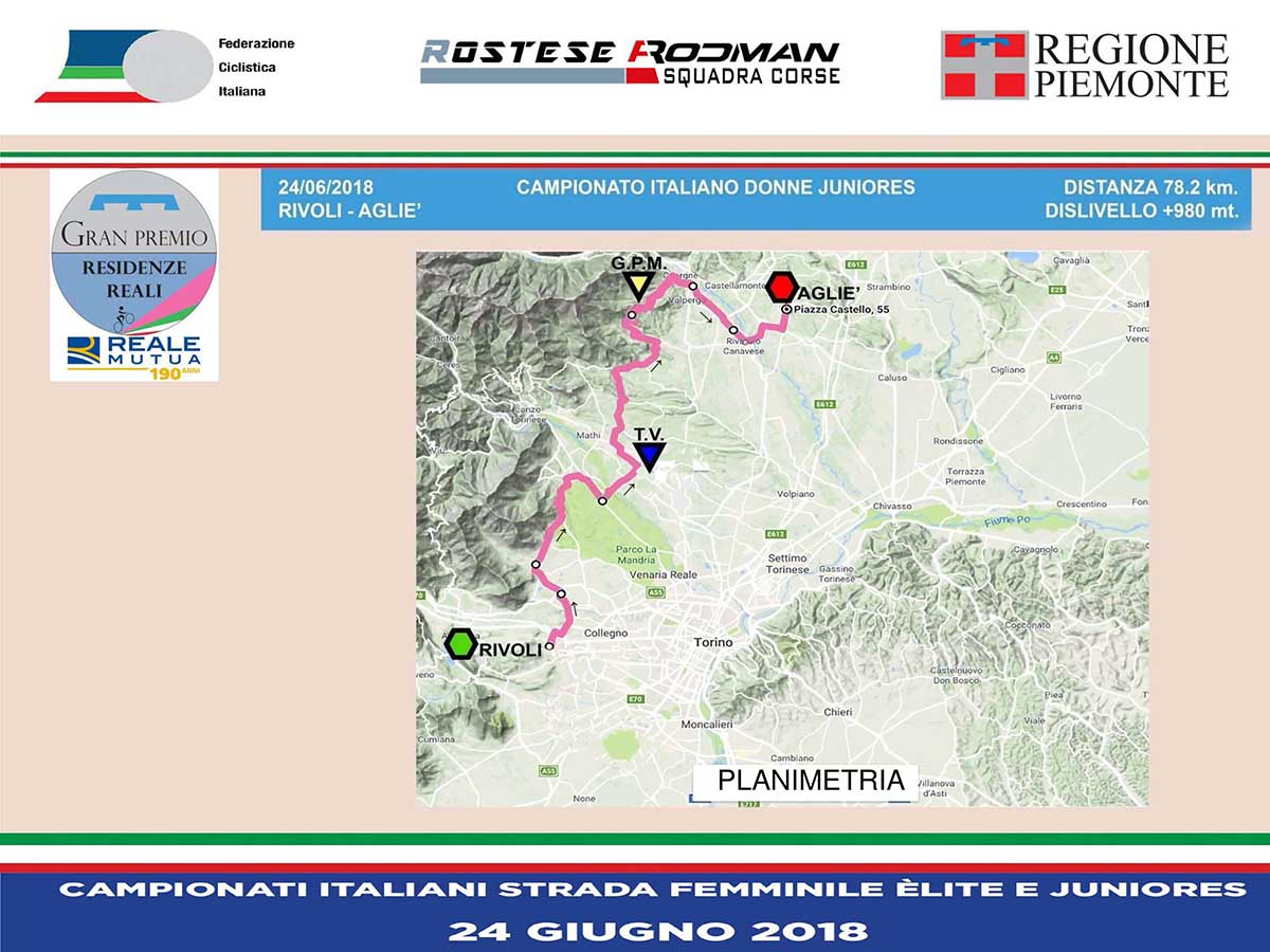 Le due prove tricolori, organizzate dal team piemontese con il prezioso sostegno dell’Assessorato regionale allo Sport, si svolgeranno domenica 24 giugno su distanze diverse (78 chilometri la prova mattutina riservata alle Juniores, 117 chilometri quella pomeridiana dedicata alle Elite) ma entrambe con partenza dal Castello di Rivoli e arrivo davanti al Castello di Agliè, con passaggio intermedio e traguardo volante, per le Elite, davanti alla Palazzina di Caccia di Stupinigi.