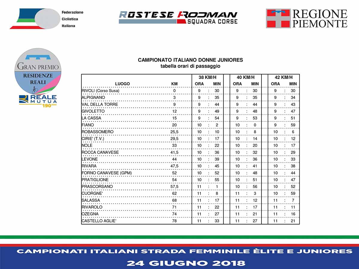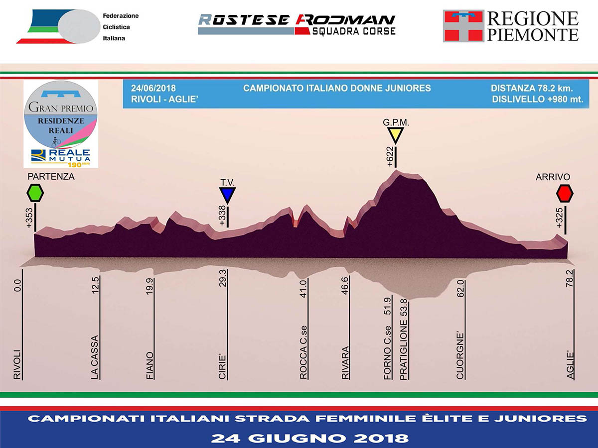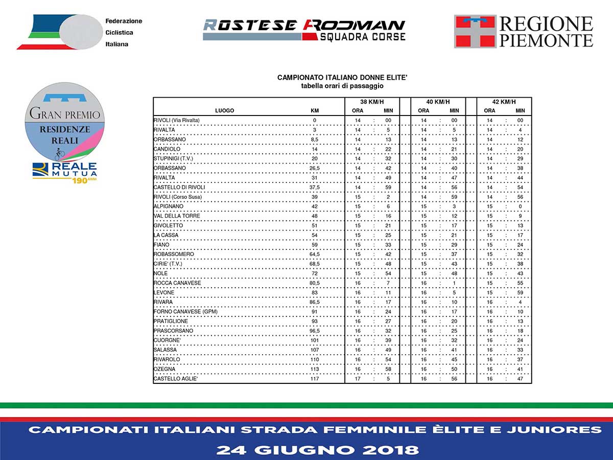 Le due prove tricolori, organizzate dal team piemontese con il prezioso sostegno dell’Assessorato regionale allo Sport, si svolgeranno domenica 24 giugno su distanze diverse (78 chilometri la prova mattutina riservata alle Juniores, 117 chilometri quella pomeridiana dedicata alle Elite) ma entrambe con partenza dal Castello di Rivoli e arrivo davanti al Castello di Agliè, con passaggio intermedio e traguardo volante, per le Elite, davanti alla Palazzina di Caccia di Stupinigi.