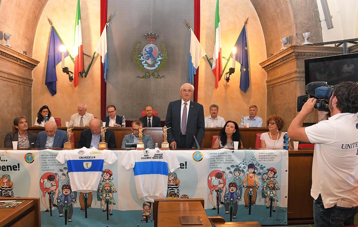 BRESCIA (BS) – È la corsa della notte, è uno degli eventi più attesi da tutti gli appassionati di ciclismo, è il 55° Trofeo Città di Brescia by Guizzi che è stato presentato questa sera nella Sala Consiliare del Comune di Brescia, in Piazza della Loggia. La spettacolare manifestazione in notturna riservata alla categoria Elite e Under 23, organizzata dal Gs Città di Brescia del presidente Fermo Fiori, si conferma uno degli appuntamenti principe dell’estate del ciclismo internazionale.