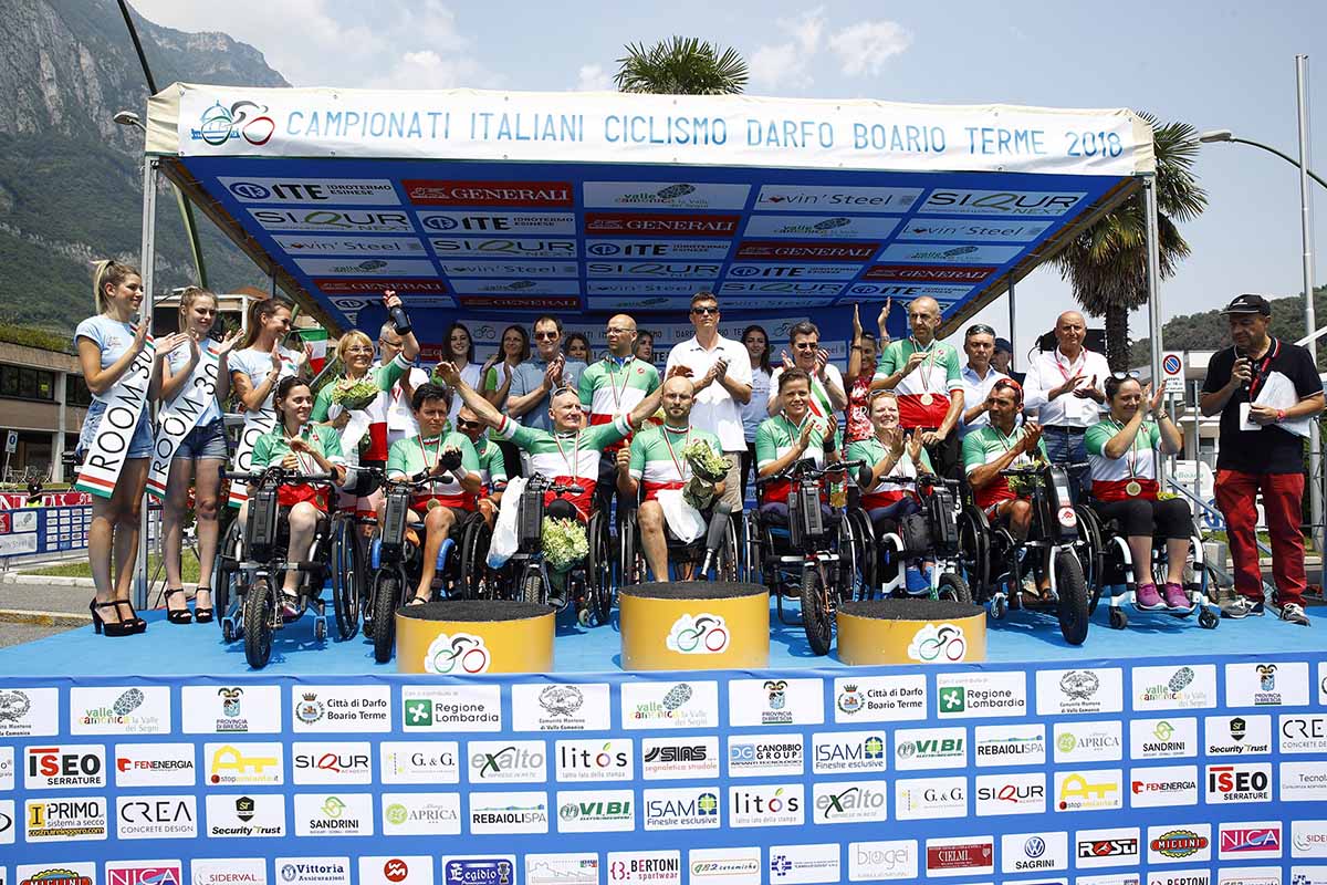 Fabrizio Cornegliani (MH1), Paolo Cecchetto (MH3), Giovanni Achenza(MH4) e Luisa Pasini (WH1), tutti e quattro del Team Equa, Luca Mazzone (MH2) del Circolo Canottieri Aniene, Diego Colombari (MH5) della Polisportiva Passo, Roberta Amadeo (WH2) del Team MTB Bee and Bike, Francesca Porcellato (WH3) dell’Active Team, Giulia Ruffato (WH4) e Ana Maria Vitelaru (WH5), entrambe dell’Anmil Sport Italia, hanno trionfato nelle prove handbike in cui competono atleti amputati e paraplegici. Giorgio Farroni (MT1) del GS Fiamme Azzurre, Livio Raggino (MT2) del Trirace Handcycling Team, Cinzia Brecciaroli (WT2) dell’ASD Preneste Bike si sono laureati campioni d’Italia in sella ai tricicli (atleti con cerebrolesioni), mentre Fabio Anobile (MC3) e Andrea Tarlao (MC5) dell’Alove Team ASD, Michele Pittacolo (MC4) della Pittabike ASD, Emanuele Bersini (MB) della Polisportiva Disabili Valcamonica, Andrea Pusateri (MC1) Namedsport Rocket, Luciano Caironi (MC2) del Team Isolmant, Beatrice Cal (WB) della CS Libertas Scorzè, Lorena Ziccardi (WC2) della ASD Maniga, Jenny Narcisi(WC4) della UC Petrignano ed Eleonora Mele (WC5) della One Gear ASD hanno primeggiato su bici e tandem (ciechi con guida).