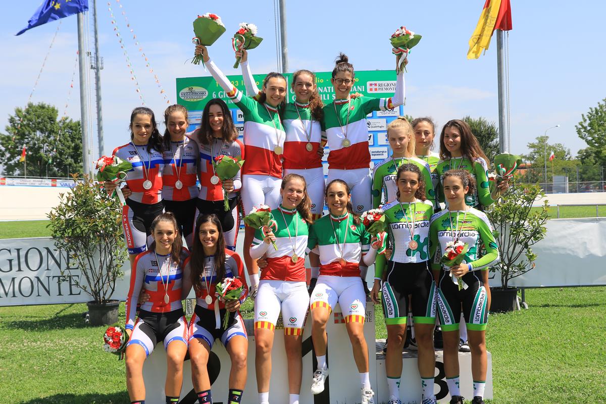 Medaglia di bronzo per la Lombardia con Aurora Mantovani (Busto Garolfo), Lucrezia Barni Gianni (Bepink), Greta Tebaldi (Eurotarget Bianchi Vitasana), Cristina Tonetti (Scv Bike Cadorago) e Sonia Rossetti (Sc Orinese) che ha partecipato alle qualifiche.