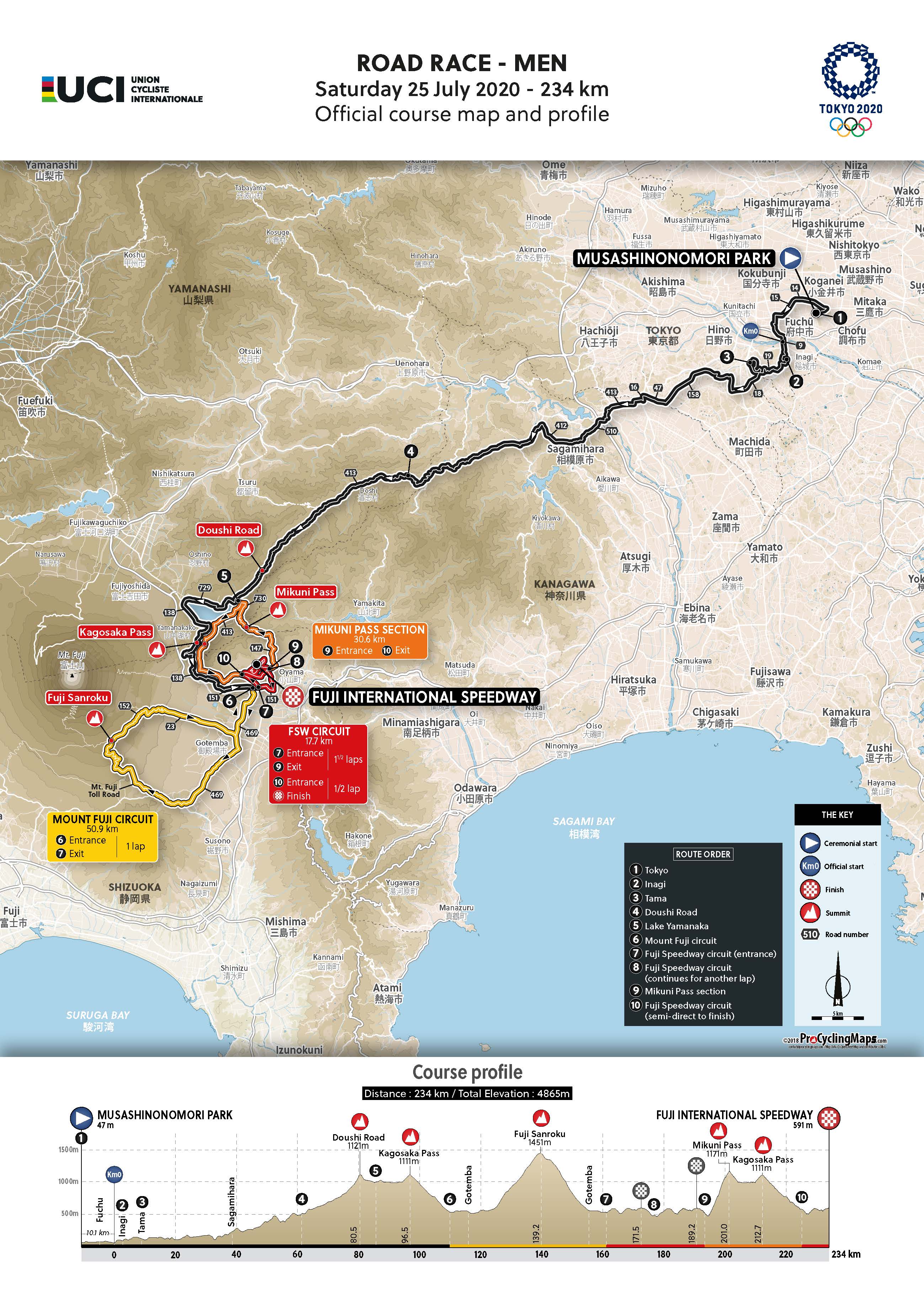 Molto più impegnativa la gara maschile che sarà lunga 234 chilometri con un totale di cinque gran premi della montagna: la prima parte di gara sarà identica a quella delle donne, poi si entrerà nel circuito del Monte Fuji con l’ascesa di Fuji Sanroku a circa 95 chilometri dall’arrivo, quindi si transiterà due volte sotto al traguardo e poi ancora salita con il duro Mikuni Pass (10% di media) e l’ultimo passaggio sul Kagosaka Pass a 21 chilometri dall’arrivo. Il dislivello complessivo sarà di 4.865 metri.