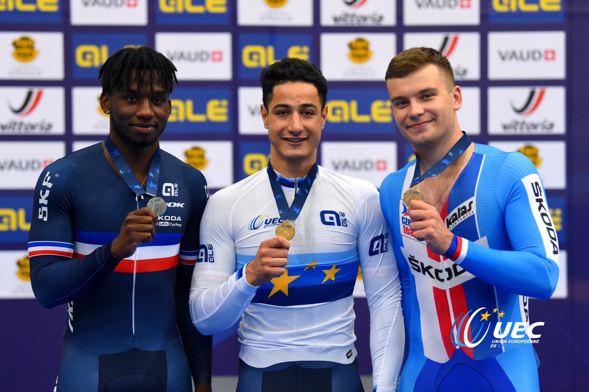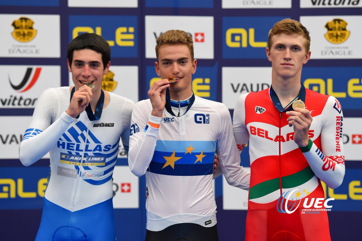 La finale del Keirin maschile Juniores ha fatto risuonare nel velodromo di Aigle le note della “Marsigliese” con il successo e il titolo europeo festeggiato dal francese Florian Grengbo che in volata ha battuto il polacco Cezary Laczkowski, medaglia d’argento, ed il ceco Jacub Stastny, medaglia di bronzo.