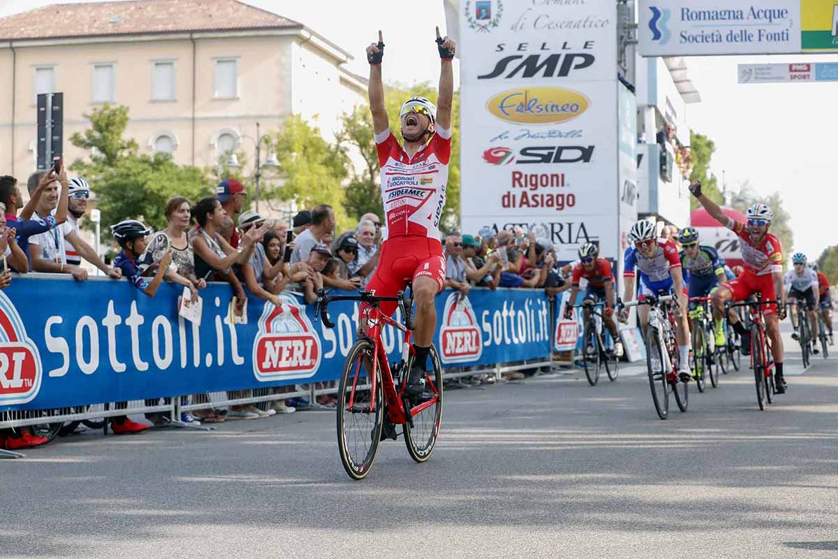 CESENATICO (FC) – Davide Ballerini (Androni-Sidermec) ha vinto il Memorial Marco Pantani regolando allo sprint un gruppetto di 18 fuggitivi sul traguardo di Cesenatico, nella gara che ricorda la memoria dell’indimenticato “Pirata” del ciclismo a vent’anni di distanza dalla sua incredibile doppietta Giro-Tour. Secondo posto per il giovane neoprofessionista francese David Gaudu (Groupama-FDJ) e terzo il valtellinese Francesco Gavazzi, vincitore su questo traguardo nel 2016, che completa la festa in casa Androni. Per il comasco si tratta della seconda affermazione stagionale, la prima in Italia, per la formazione del team manager Gianni Savio è la trentesima dell’anno (foto BettiniPhoto).