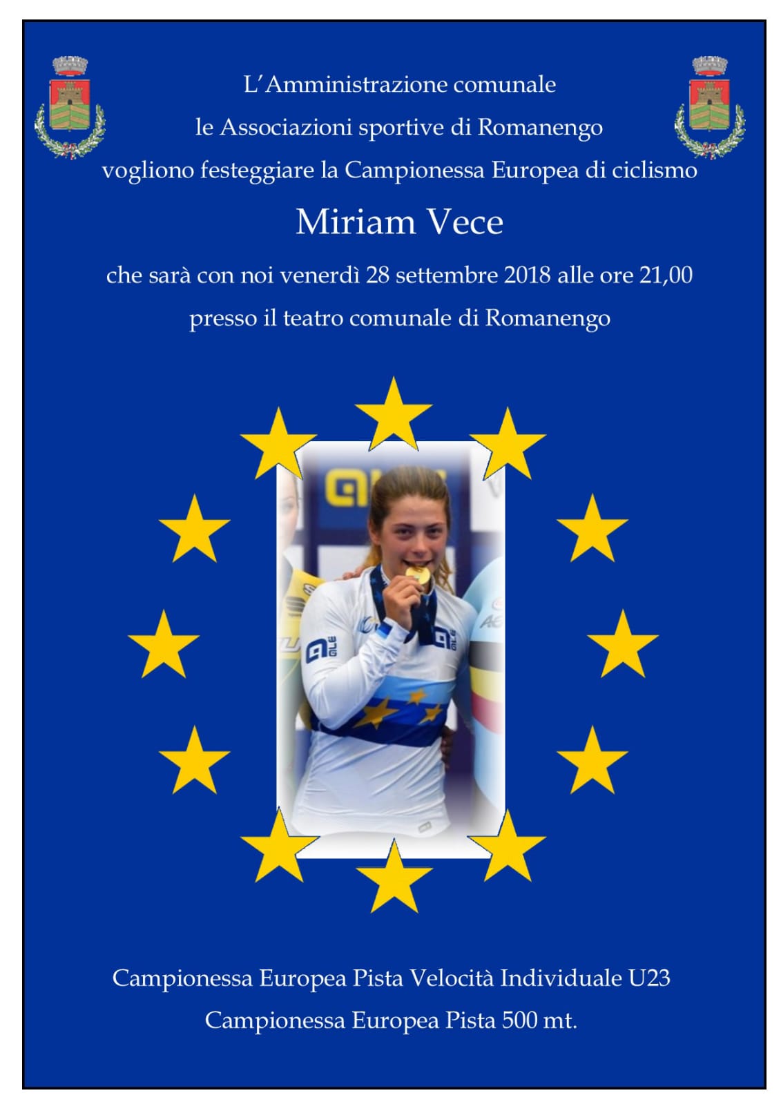 ROMANENGO (CR) – Ultimi preparativi al Teatro Comunale di Romanengo che questa sera, venerdì 28 settembre, ospiterà la grande festa in onore di Miriam Vece. La ventunenne romanenghese, specialista della pista, ha conquistato in questo 2018 nel velodromo di Aigle (Svizzera) due titoli europei nella Velocità Individuale e nei 500 metri. Un doppio titolo continentale che le Associazioni Sportive di Romanengo e l’Amministrazione Comunale del piccolo paese della provincia di Cremona vogliono celebrare con una serata interamente dedicata alla giovane atleta tesserata da sempre per la Valcar PBM di Bottanuco.