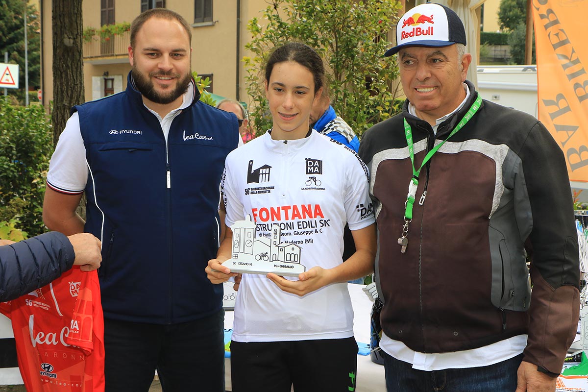 210 iscritte, 167 partenti: i numeri della classica organizzata dalla SC Cesano Maderno, valida inoltre come ultima prova della Challenge Rosa della Brianza, sono come sempre da campionato italiano. La corsa procede senza particolari sussulti e, ai piedi dell’ascesa finale, il gruppo è compatto, con tutte le favorite nelle posizioni di testa. A pochi chilometri dal traguardo scatta l’ossolana Francesca Barale. La progressione della giovane scalatrice diretta in ammiraglia da zio Riccardo è costante. Sylvie Truc (Racconigi Cycling Team) prova a riprendere la fuggitiva, ma il vantaggio della battistrada è sufficientemente ampio per consentire alla quindicenne di Villadossola di tagliare il traguardo in perfetta solitudine. La Truc chiude seconda e accusa 30” di ritardo dalla vincitrice. Il gruppo giunge a 52”, anticipato dalla maglia tricolore di Eleonora Gasparrini, terza, che precede di poco l’imolese Alessia Patuelli (Re Artù).