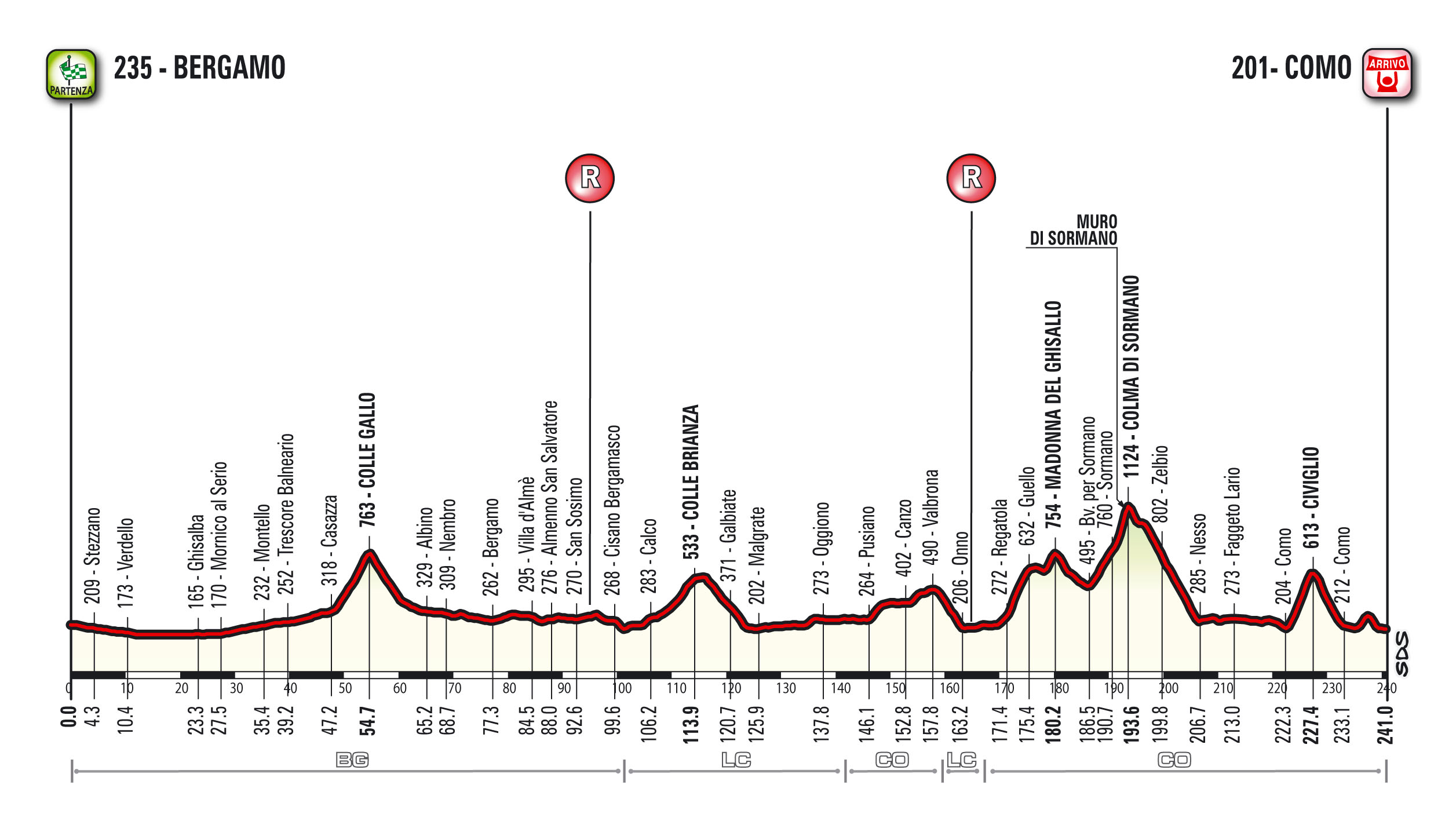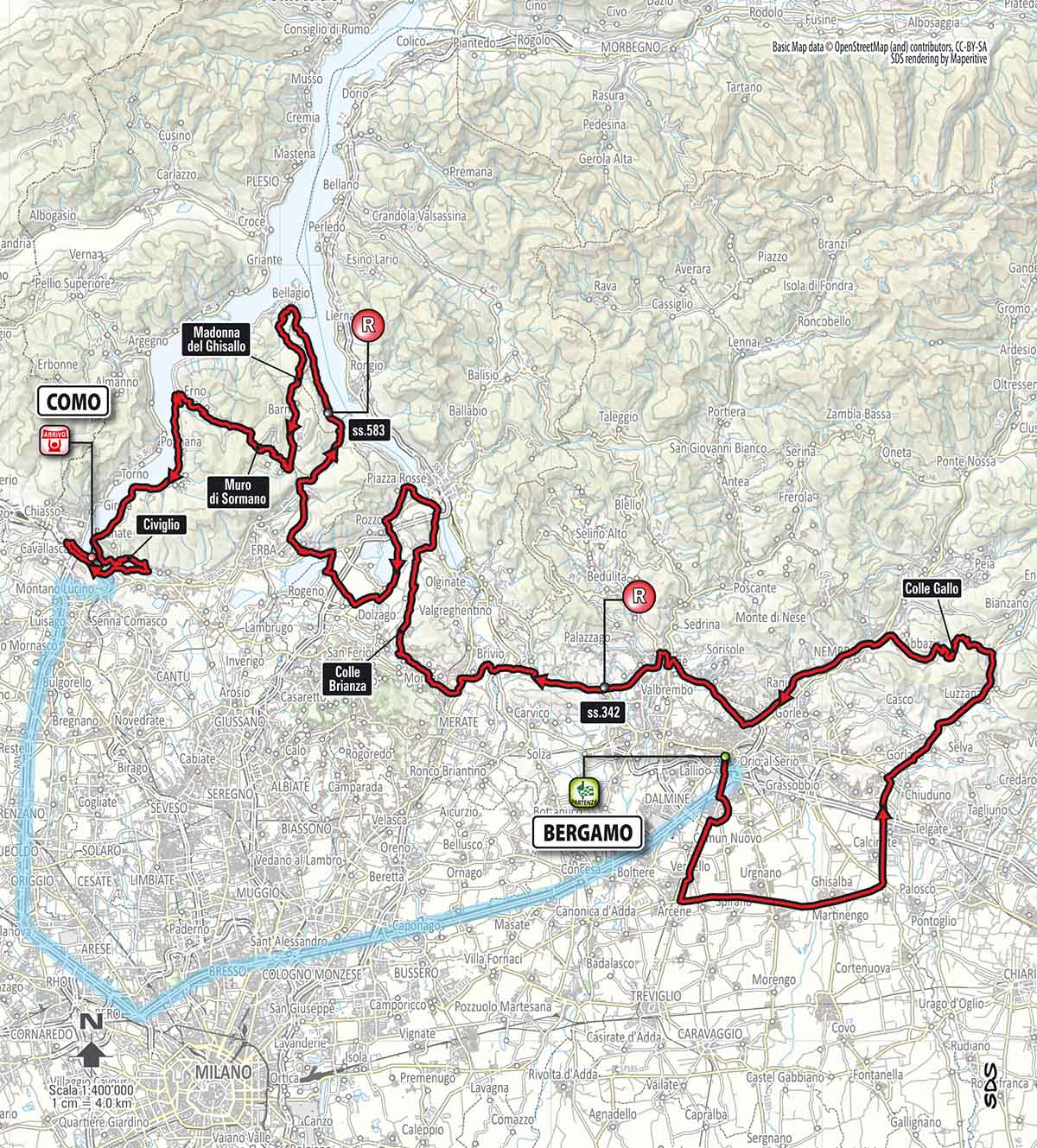 Partenza da Bergamo in direzione sud attraversando nei primi 40 km la pianura bergamasca per risalire la val Cavallina fino a Casazza dove si affronta la prima salita della corsa, il Colle Gallo (763 m). Il colle è seguito da una discesa veloce fino a rientrare dalla val Seriana su Bergamo. Ci si immette quindi nuovamente in strade di pianura che conducono in Brianza. Passaggio breve per Colle Brianza (533 m) e discesa su Pescate per puntare su Valmadrera e poi in direzione Oggiono e, infine, attraverso Pusiano, Asso e la discesa su Onno, portarsi a Bellagio dove inizia la salita del Ghisallo (754 m), con pendenze fino al 14% su strada ampia con diversi tornanti. La discesa, molto veloce, si svolge per lunghi rettilinei e si interrompe a Maglio dove immediatamente dopo la svolta a destra inizia la salita della Colma di Sormano (1124 m). Alcuni km di media pendenza e quindi poche centinaia di metri dopo Sormano si imbocca a sinistra il Muro di Sormano (2 km al 15%) su strada stretta, molto ripida, in parte all’interno di un boschetto, con tornanti strettissimi e con pendenze che attorno ai 1000 m di percorrenza superano il 25% fino a sfiorare il 30%. Superata la Colma segue la discesa (in falsopiano nella prima parte, poi molto impegnativa con molti tornanti e carreggiata stretta) su Nesso dove si riprende la strada costiera per raggiungere Como. Si affronta la dura salita verso Civiglio (614 m) con pendenze praticamente sempre attorno al 10% (da segnalare un marcato restringimento della carreggiata in vetta alla salita) per ridiscendere e, riattraversando Como, superare l’ultima breve salita ai piedi di San Fermo della Battaglia. Sono presenti due rifornimenti fissi: il primo a San Sosimo (km 92-95) e il secondo a Onno (km 163-166).