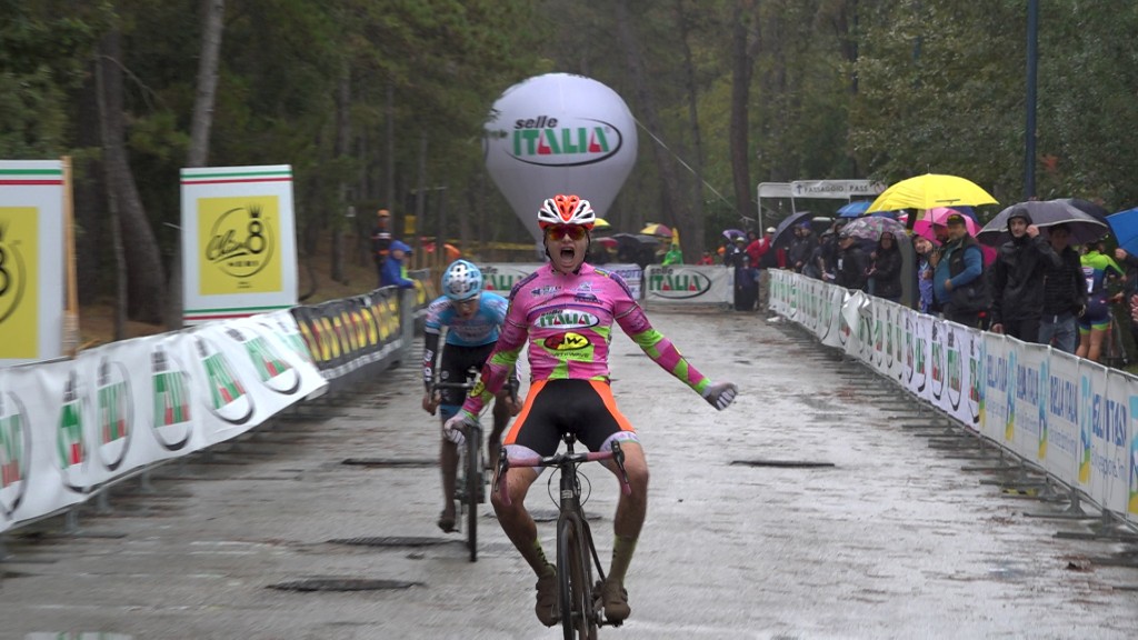 ALLIEVI (15-16 anni) – È la gara più partecipata di giornata ed è quella su cui il cielo sembra volersi accanire di più. Acqua in testa ai 120 corridori dal primo all’ultimo metro, in una gara ricchissima di colpi di scena in un crescendo di epicità. Si rinnova la sfida Piemonte-Abruzzo-Puglia (Gioele Solenne, Lorenzo Masciarelli e Vittorio Carrer) con il pugliese del team Eurobike messo fuori gioco da un irreparabile guasto meccanico pochi metri dopo l’uscita della corsia box. Occhiali sporchi di fango e vista annebbiata a rendere più complesso il transito nella pineta. All’arrivo lo scenario è esattamente l’opposto di Forni Avoltri: è sprint lunghissimo ma ad avere la meglio questa volta è la maglia rosa di Gioele Solenne (ASD Team Bramati), che con una volata magistrale e un urlo liberatorio brucia sul traguardo l’abruzzese Lorenzo Masciarelli (Callant Doltcini Cycling Team). A difendere i colori della Puglia ci pensa il biscegliese Ettore Loconsolo (Team Eurobike Corato), che dopo una gara in crescendo sprinta sul traguardo mettendo in bella vista la sua maglia tricolore di campione italiano.