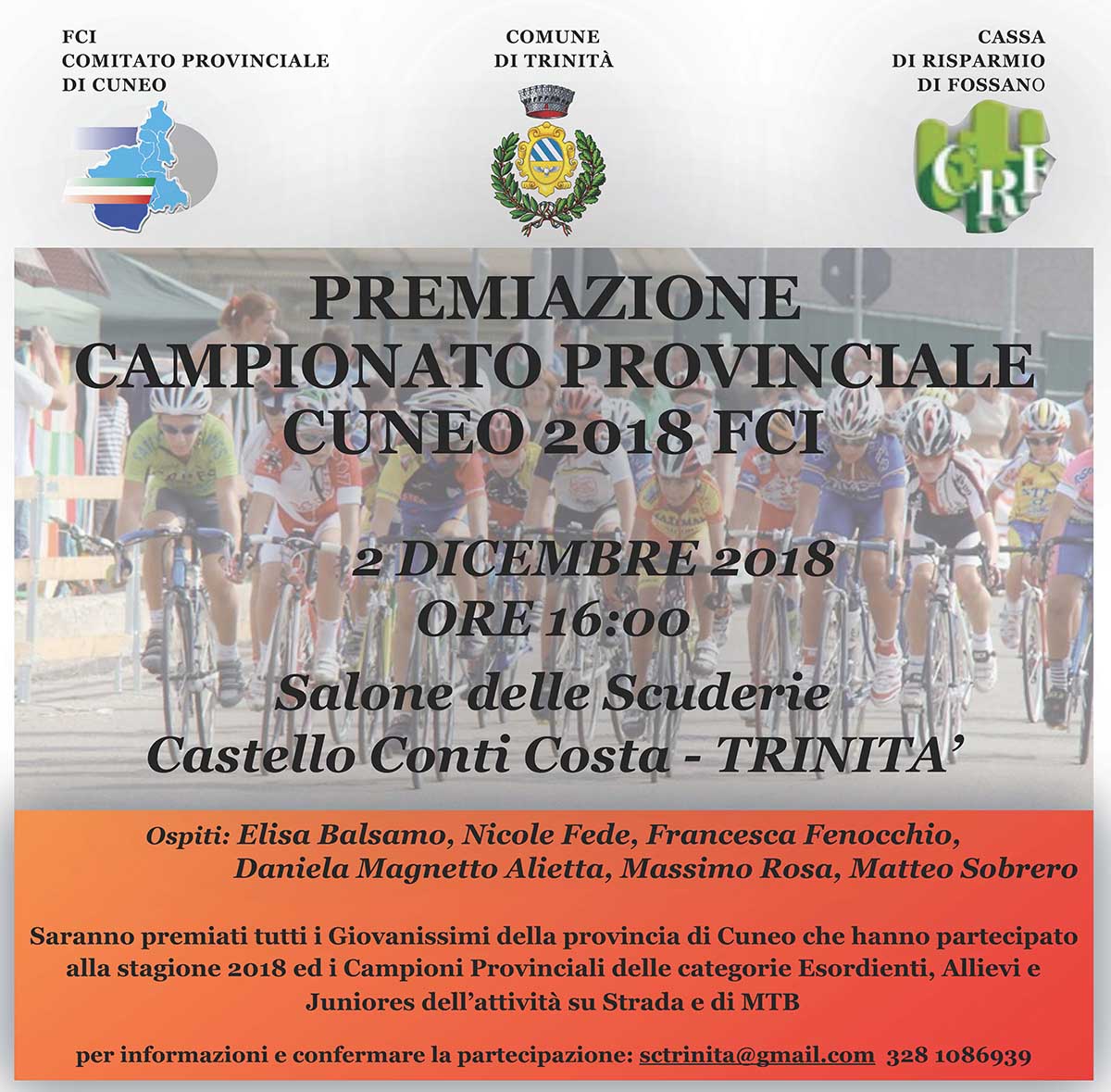 Nell’occasione saranno premiati tutti i Giovanissimi della provincia di Cuneo che hanno partecipato alla stagione 2018 ed i campioni provinciali delle categorie Esordienti, Allievi e Juniores dell’attività su strada e di MTB.