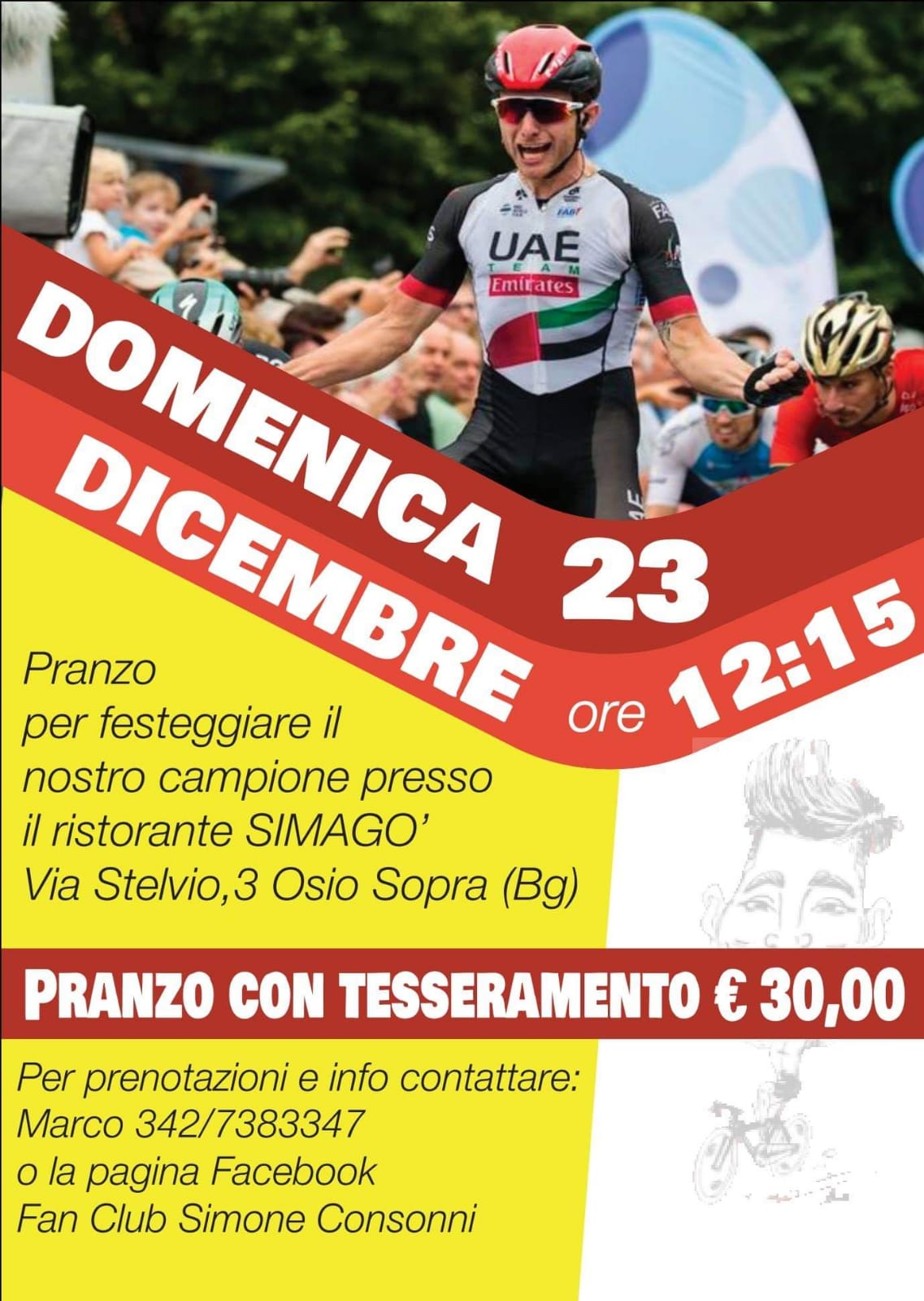 OSIO SOPRA (BG) – Domenica 23 dicembre alle ore 12,15 al ristorante Simagò di via Stelvio, 3 ad Osio Sopra (Bg) si radunerà il Fans Club Simone Consonni.