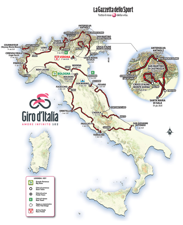 Il Direttore del Giro d’Italia, Mauro Vegni, ha evidenziato come:<<Il rapporto della Corsa Rosa con il Veneto è storico e risale agli albori del Giro, esattamente il 19 maggio 1912. Tantissime tappe (285 tra partenze e arrivi) da allora si sono disputate in questa splendida Regione. Quest’anno, in particolare, il Veneto sarà il giudice ultimo della 102esima edizione con l’arrivo per velocisti a Santa Maria di Sala e la ripartenza il giorno seguente da Treviso. Le ultime due frazioni della corsa incoroneranno il vincitore, colui che alzerà al cielo il Trofeo senza Fine. La Feltre – Croce d’Aune-Monte Avena sarà l’ultimo appello per gli scalatori mentre, il giorno seguente, nello splendido scenario di Verona e della sua Arena, la cronometro individuale darà il verdetto finale. Sono certo che sarà una grande festa dello sport e del ciclismo in particolare, nella Regione che ha il numero di appassionati e praticanti più alto d’Italia>>.