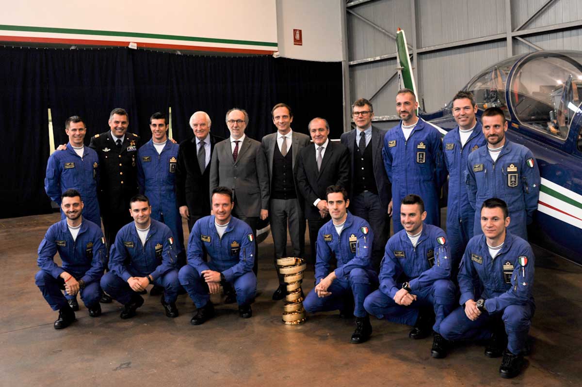 I relatori della Conferenza Stampa, le Frecce Tricolori ed il Trofeo Senza Fine (foto Aeronautica Militare)