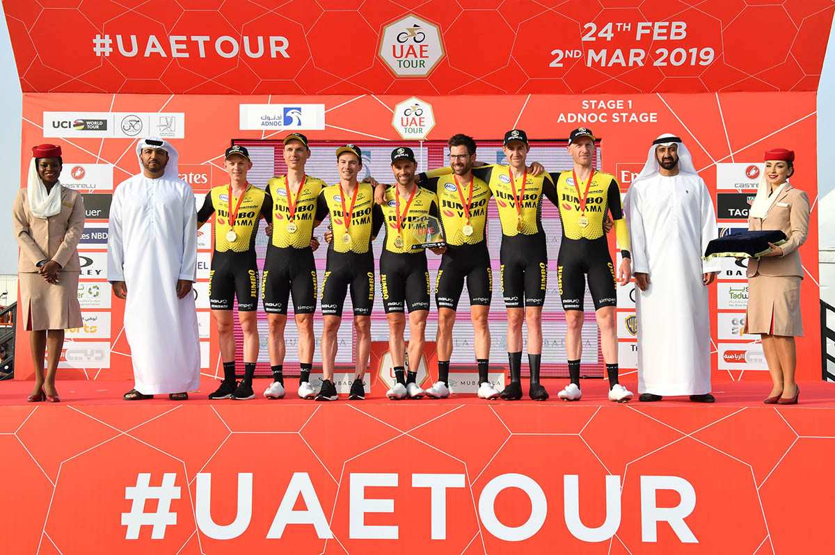 AL HUDAYTIAT ISLAND (EMIRATI ARABI UNITI) – La Jumbo-Visma ha vinto la cronometro a squadre di 16 km che oggi ha aperto la prima edizione dell’UAE Tour. Lo sloveno Primoz Roglic ha tagliato per primo il traguardo e per questo ha indossato la prima maglia rossa di leader della classifica generale della nuova competizione WorldTour.