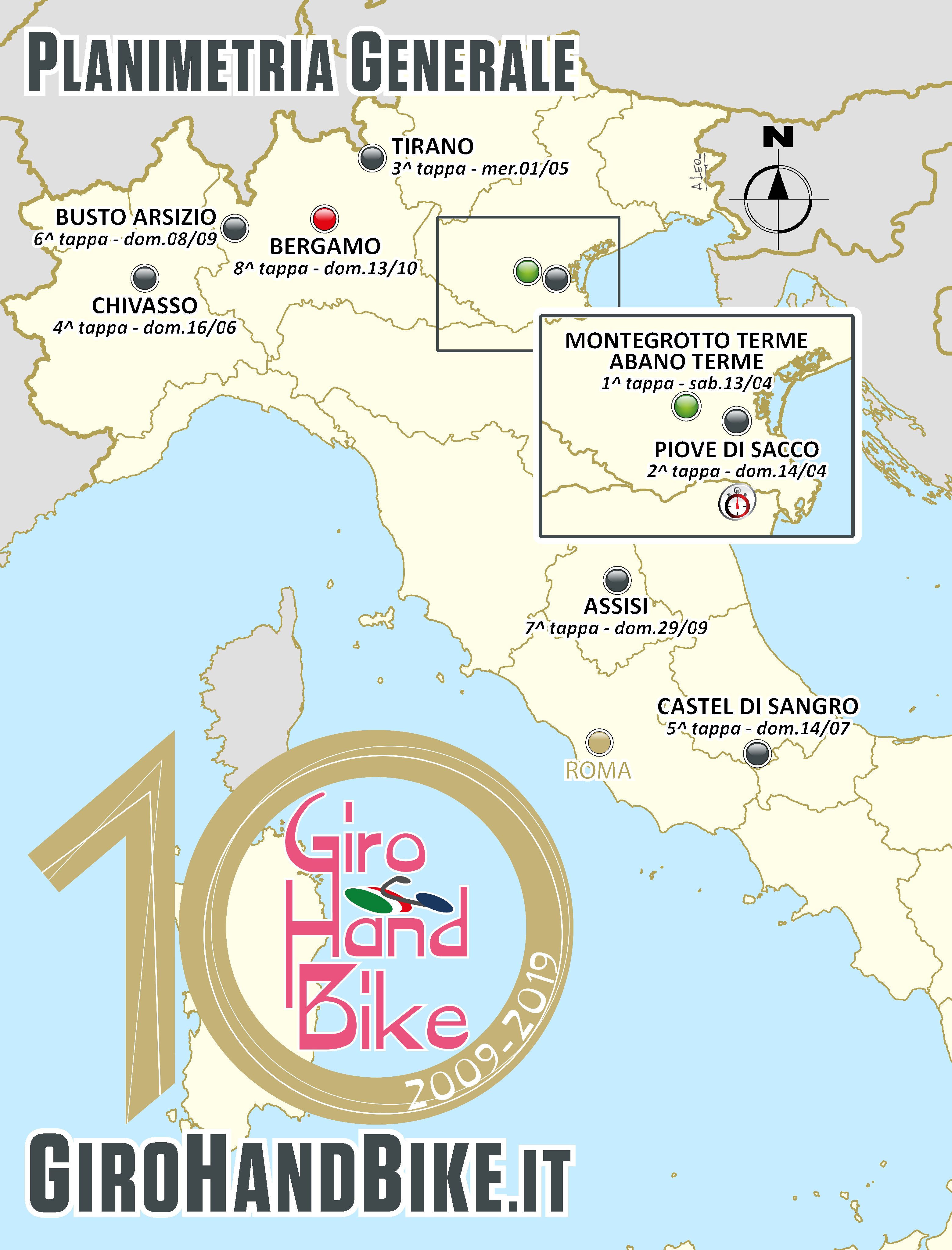 «Numerosissime quest’anno le richieste da parte di molte città per aggiudicarsi una tappa del Giro d’Italia di Handbike – esordisce il Cav. Andrea Leoni Patron del GIHBe la scelta non è stata facile perché vorremmo che i nostri #campionidivita gareggiassero in ogni luogo del Bel Paese». Si parte quindi ad aprile dalle terme euganee di Montegrotto per poi fare tappa in Valtellina; dal Piemonte a Chivasso alle montagne d’Abruzzo con un passaggio nella patria di San Francesco; ultime tappe in Lombardia tra l’operosa Busto Arsizio e la sempre più bella Bergamo dove si svolgerà la finalissima.