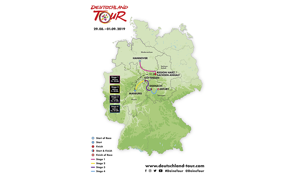 BERLINO (GERMANIA) – La seconda edizione del rinato Deutschland Tour è in programma dal 29 agosto al 1° settembre e si svolgerà nel cuore della Germania. L’unica corsa a tappe maschile per professionisti che si svolge in Germania interesserà gli stati federali di Bassa Sassonia, Sassonia-Anhalt, Assia e Turingia.