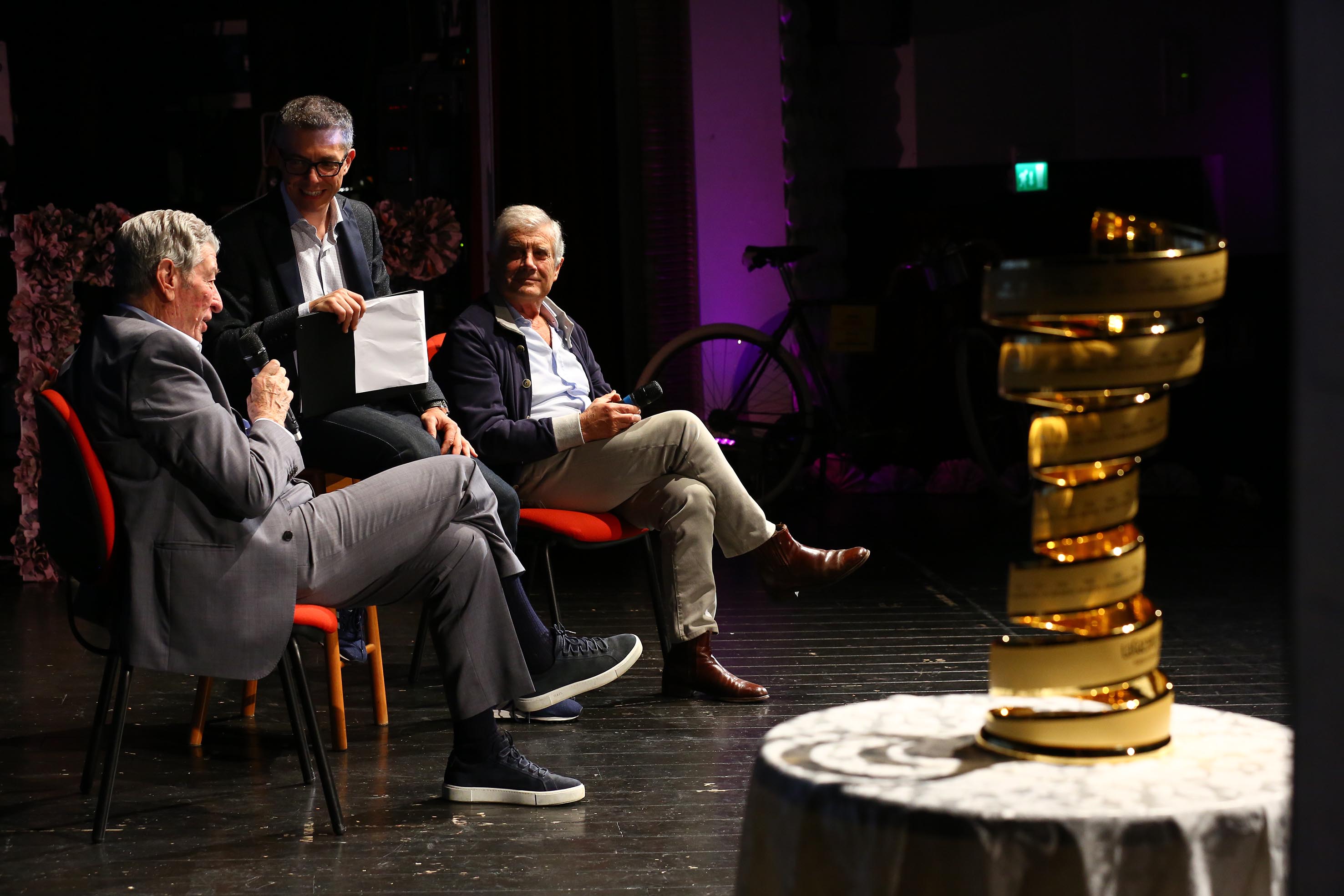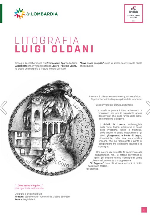 Durante la serata molti sono stati i premi e i riconoscimenti consegnati agli ospiti: dalle litografie realizzate dall’artista bergamasco Luigi Oldani alle fotografie delle proiezioni dedicate al Giro d’Italia che da settimane illuminano gli edifici loveresi che si affacciano sul lungolago. Tra le premiazioni, spicca quella di Antonio Allegra, responsabile del mercato Italia di Panini, che ha consegnato ai comuni sedi di partenza e arrivo della 16° Tappa le ‘maxi figurine’ raffiguranti le città di Lovere e di Ponte di Legno, e durante la serata il pubblico presente ha ricevuto copie dell’album Panini e le prime figurine con i corridori del Giro d’Italia 2019.