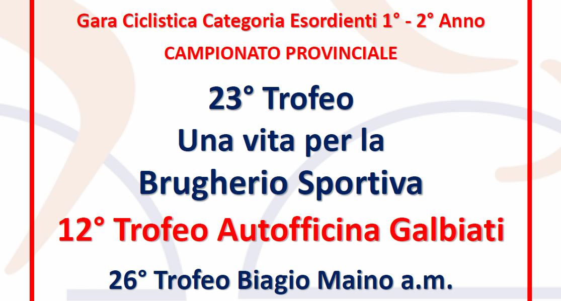 BRUGHERIO (MB) – Domenica 12 maggio 2019 a Brugherio (Monza Brianza) la Società Ciclistica Brugherio Sportiva organizza il 23° Trofeo Una Vita per la Brugherio Sportiva – 12° Trofeo Autofficina Galbiati – 26° Trofeo Biagio Maino a.m.