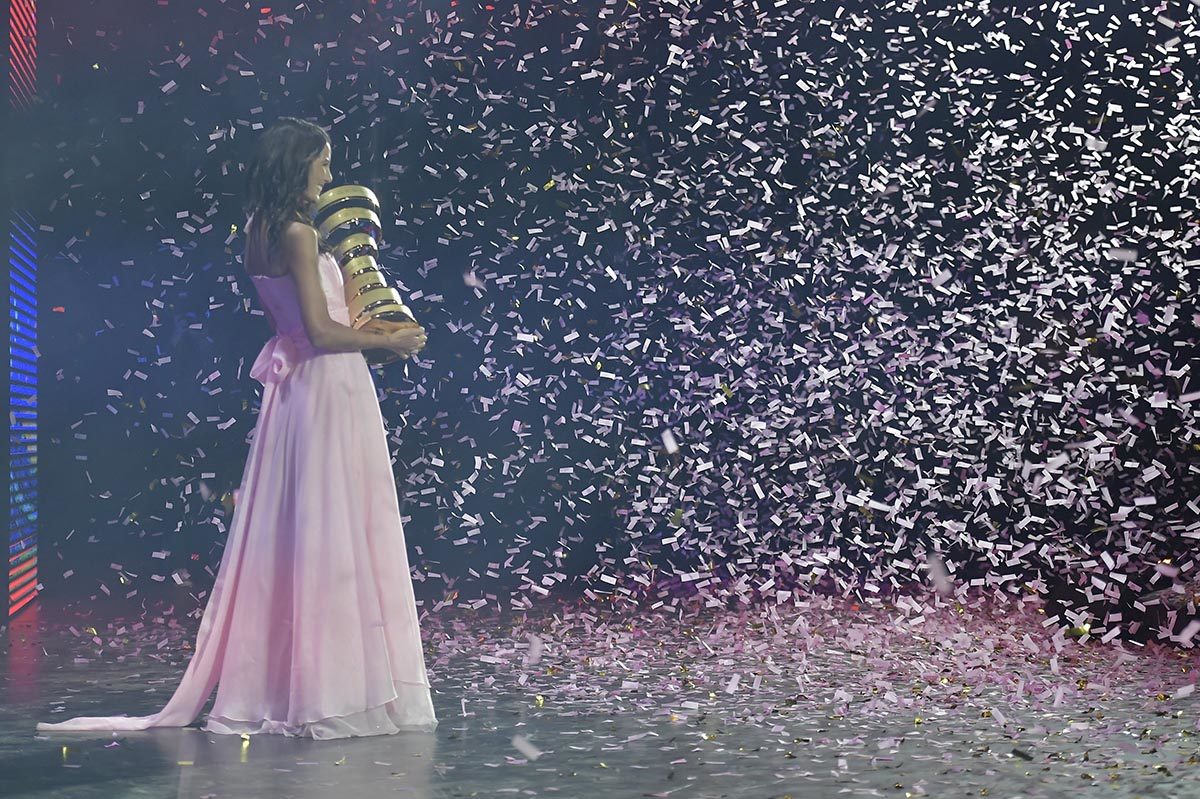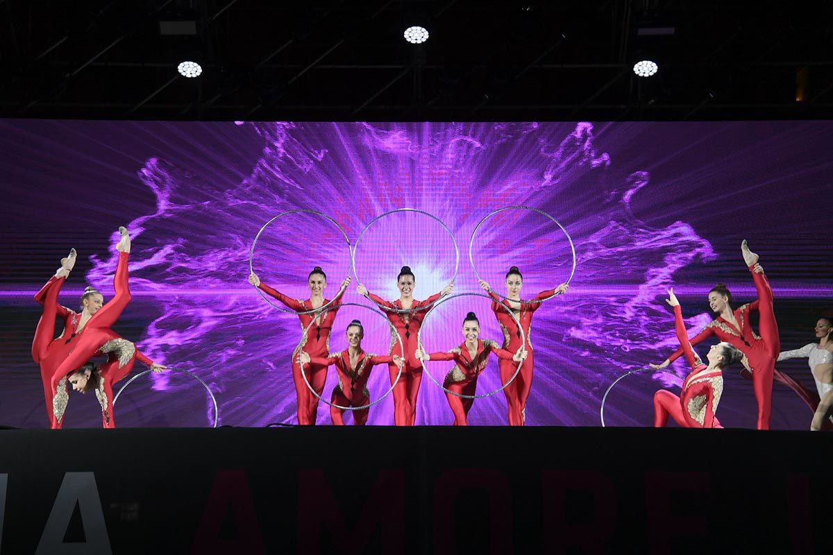 Le Farfalle, la Nazionale Italiana di Ginnastica Ritmica, si sono esibite sul palco del Giro d’Italia in occasione anche del 150enario dalla fondazione della Federazione Ginnastica Italiana (foto LaPresse).