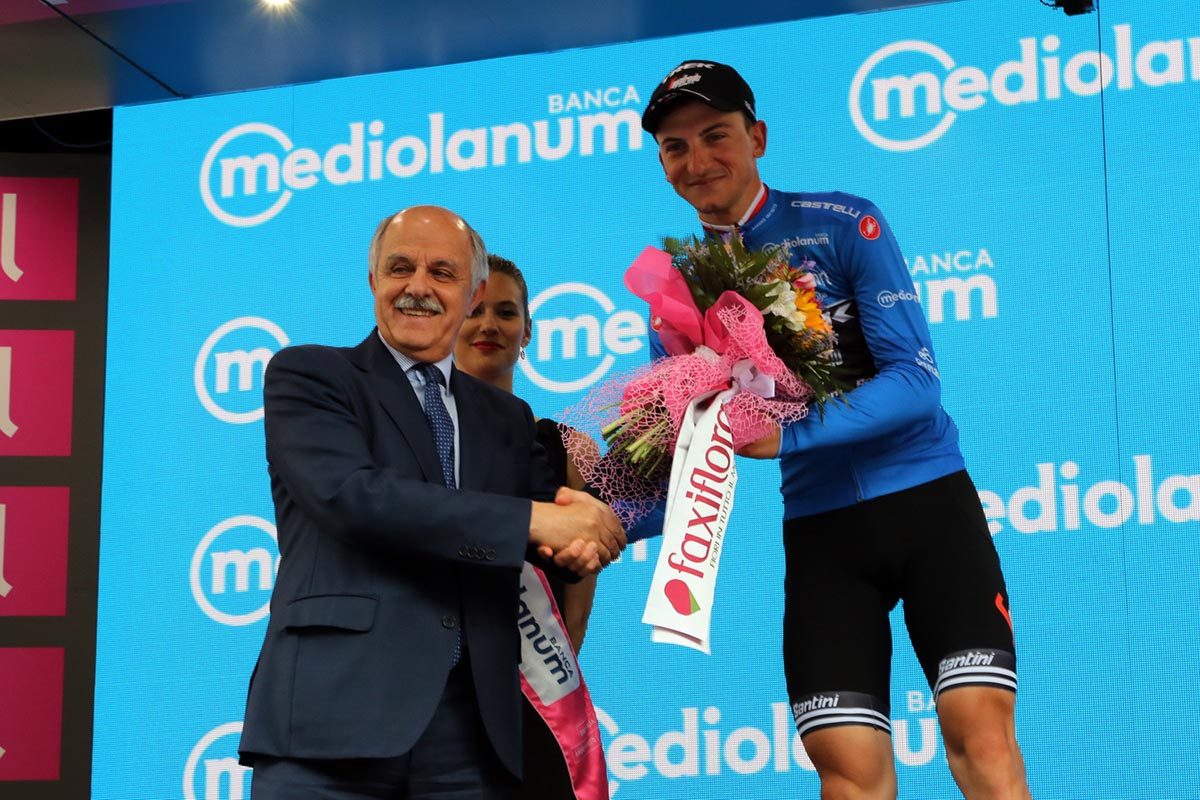 La maglia azzurra Giulio Ciccone premiato dal presidente FCI Renato Di Rocco (foto Photobicicailotto)