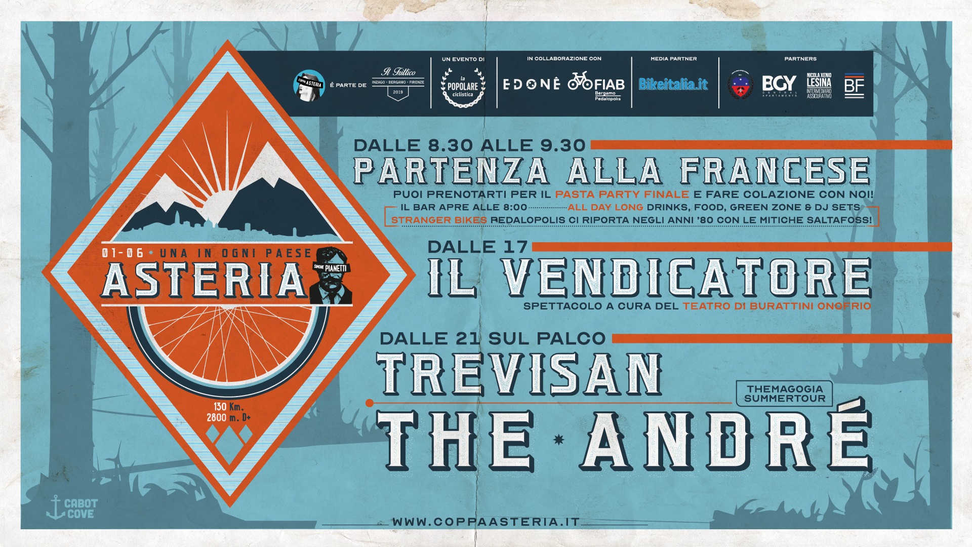 Coppa Asteria non è la classica manifestazione per cicloamatori, ma una vera e propria festa, dove la bicicletta è solo una scusa per stare insieme. A completare questa manifestazione ciclistica amatoriale infatti, ci saranno due appuntamenti gratuiti dedicati a tutti: il primo è uno spettacolo più unico che raro sulla figura di Simone Pianetti, il secondo è il concerto di The André.