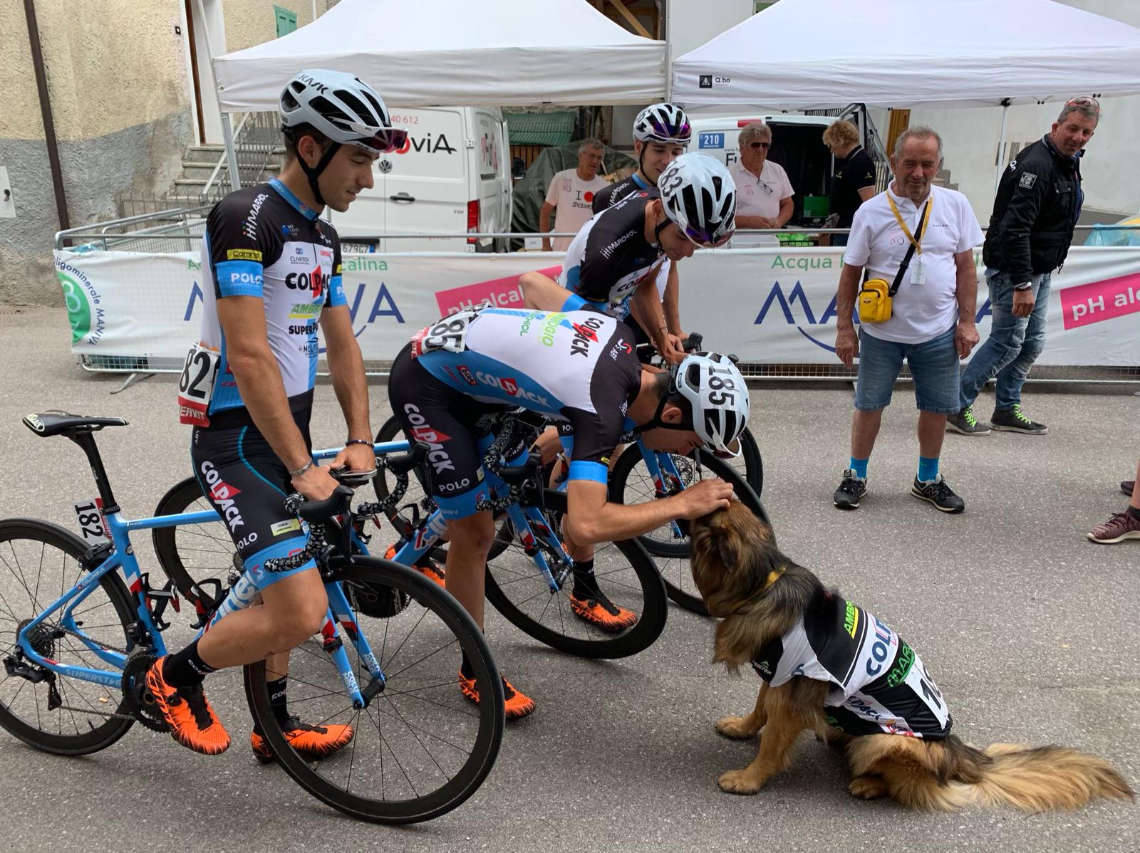 Stamattina abbiamo però trovato ad aspettarci il cane di Alessandro Covi, che si chiama Simba, e che in perfetta tenuta Colpack si era anche attaccato il numero 183 che è lo stesso che porta Ale per questo Giro. Simba, è il primo tifoso Colpack e mentre si sta facendo tutto il Giro in camper con la sua famiglia, la sua mamma che è la stessa di Alessandra ahahahhaahah ogni giorno da ex atleta percorre gli ultimi 50 km di gara che fanno i ragazzi ed oggi si è presa anche un bel acquazzone. Quindi anche per lei da domani ultime due tappe 🙂