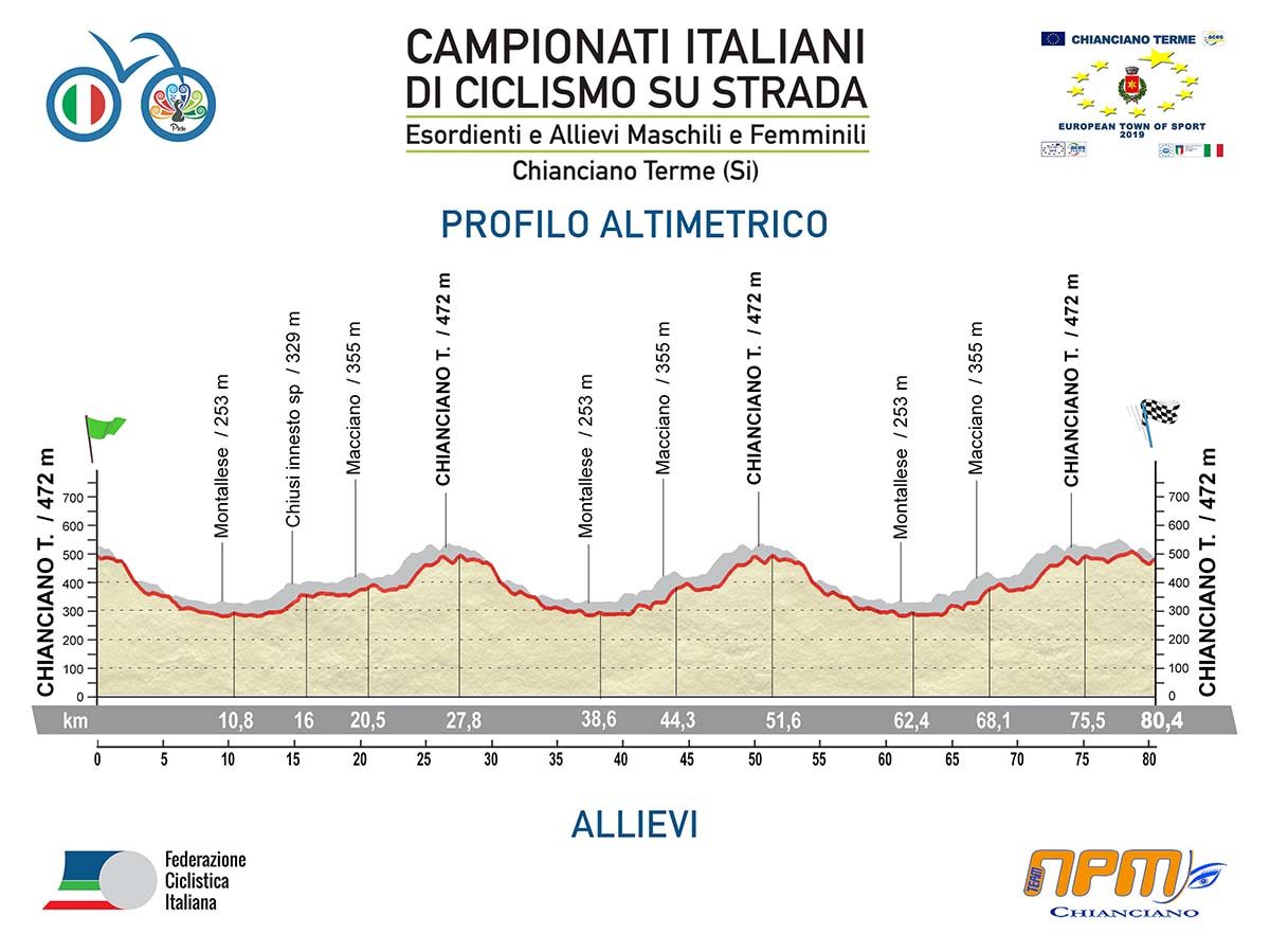 CHIANCIANO TERME (SI) – Tra una settimana esatta Chianciano Terme si vestirà di tricolore ospitando per la prima volta i Campionati Italiani Giovanili di ciclismo su strada per le categorie Allievi ed Esordienti maschi e femmine. Dopo tre anni a Boario Terme, altri tre a Comano Terme, sarà quest’anno la cittadina termale toscana, che quest’anno è anche Capitale Europea dello Sport, ad accogliere la colorata manifestazione con la speranza di iniziare un nuovo e fortunato ciclo.