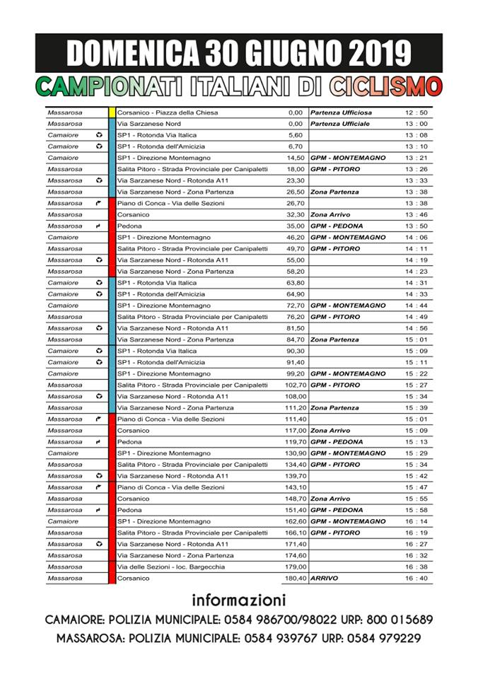 Sarà una grande giornata di sport che potrete seguire in differita anche su RAI Sport (40 minuti dopo la cerimonia di premiazione) o con live parziali sulla pagina Facebook “Campionati Italiani Ciclismo – Corsanico 2019”. Orario di arrivo previsto alle ore 17:30 a Corsanico in Via delle Sezioni.