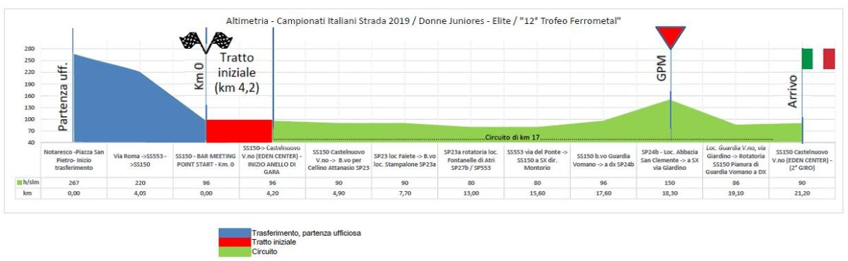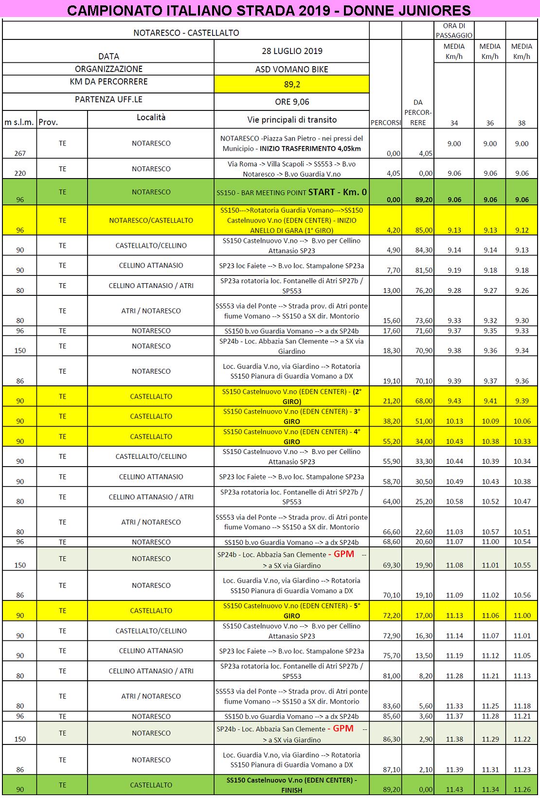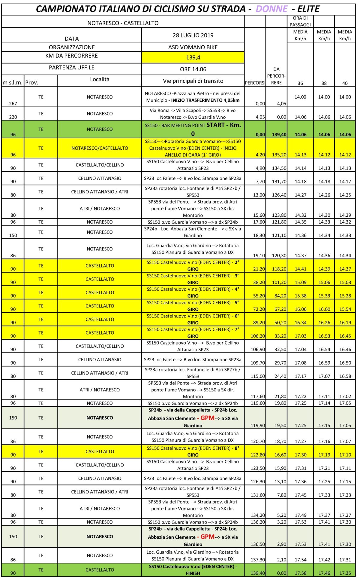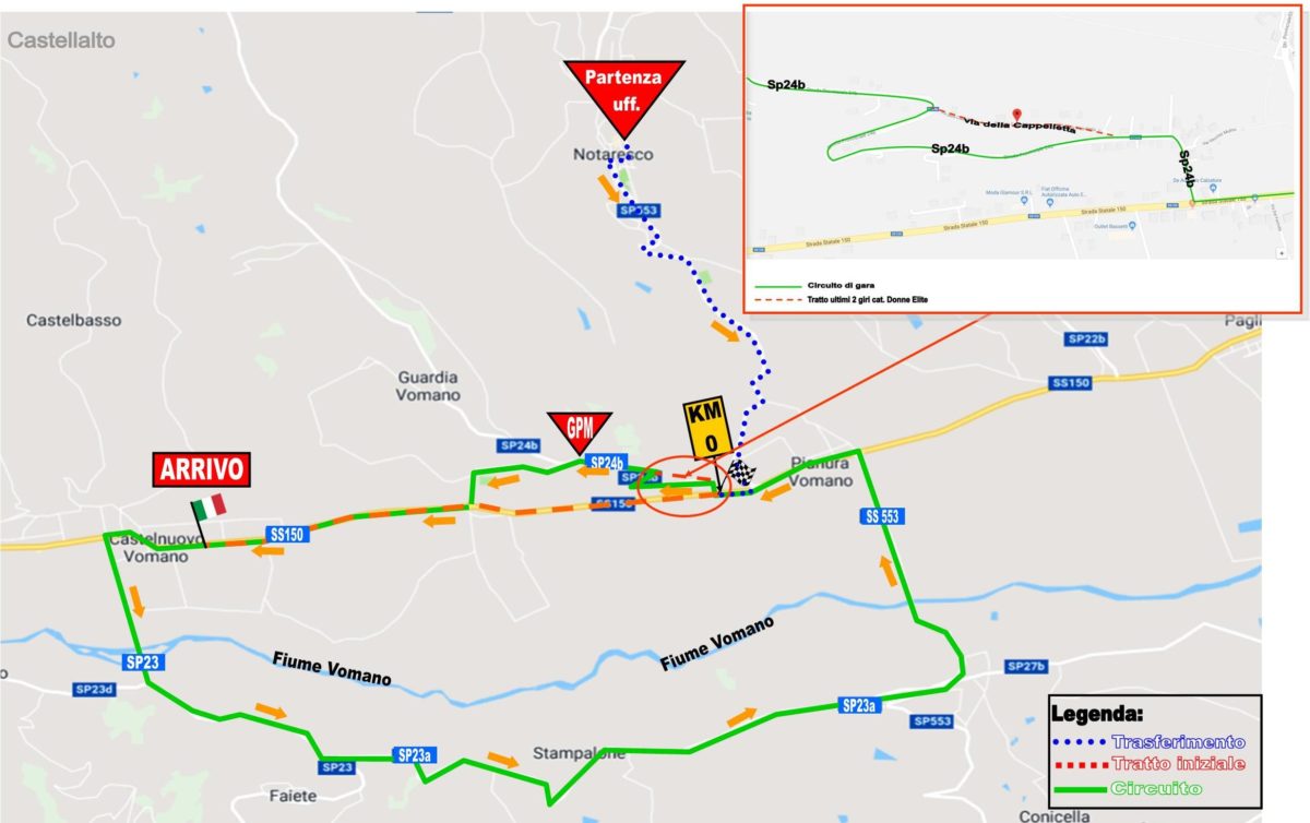 Dopo il via ufficioso da Piazza San Pietro e la parata per le vie di una Notaresco bardata con il tricolore le atlete raggiungeranno il km 0, ovvero la partenza ufficiale, in corrispondenza del bar Meeting Point sulla SS 150. Di lì avrà inizio un percorso di 17 km disegnato su ambedue le sponde del fiume Vomano. Il manto stradale è in corso di rinnovamento proprio per l’importante rassegna nazionale e già in questi giorni le atlete in ricognizione possono trovare il 70% del percorso con asfalto nuovo.