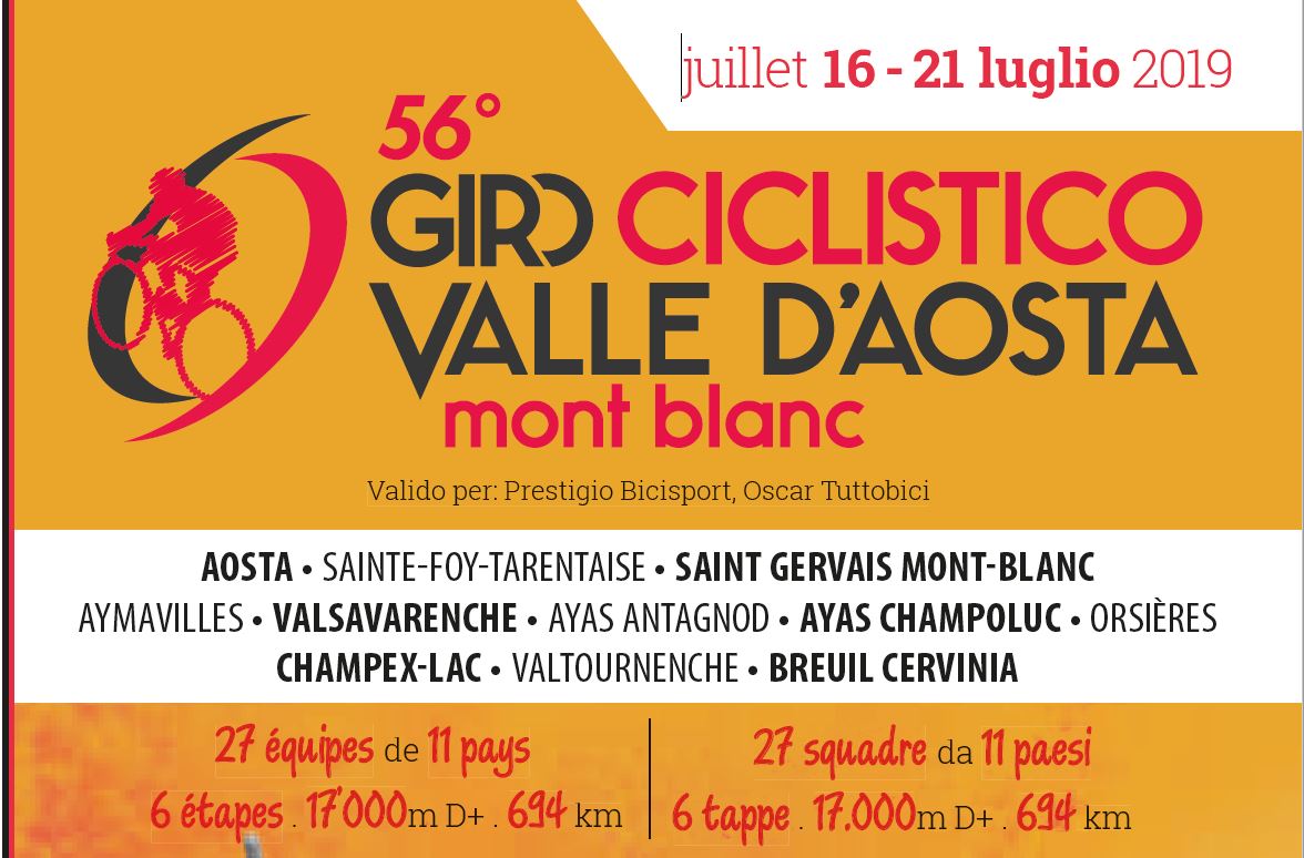 AOSTA (AO) – Da martedì 16 luglio è in programma il 56° Giro Ciclistico Internazionale della Valle d’Aosta – Mont Blanc che si concluderà il 21 luglio 2019. Sei giorni di gara, 694 chilometri a cavallo tra Valle d’Aosta, Francia e Svizzera e tanta salita il menù proposto dalla Società Ciclistica Valdostana.
