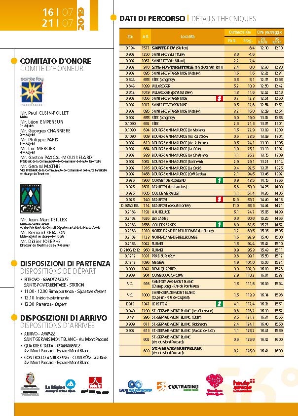 Mercoledì 17 luglio, invece, si andrà in Francia con la tappa che, prendendo il via da Sainte Foy Tarentaise, si concluderà a Saint Gervais Mont Blanc dopo aver scalato i GPM del Cormet de Roselend, del Col des Saisies e di Le Bettex.