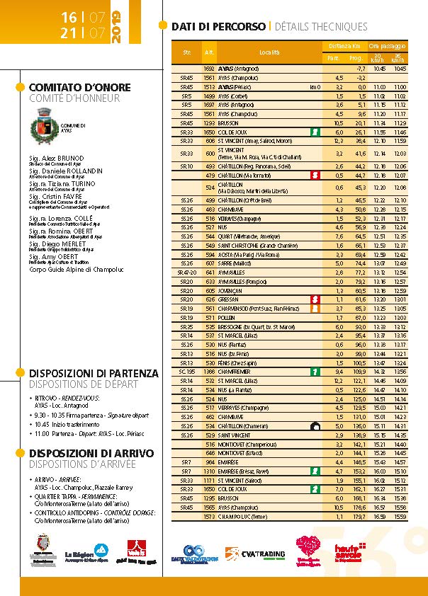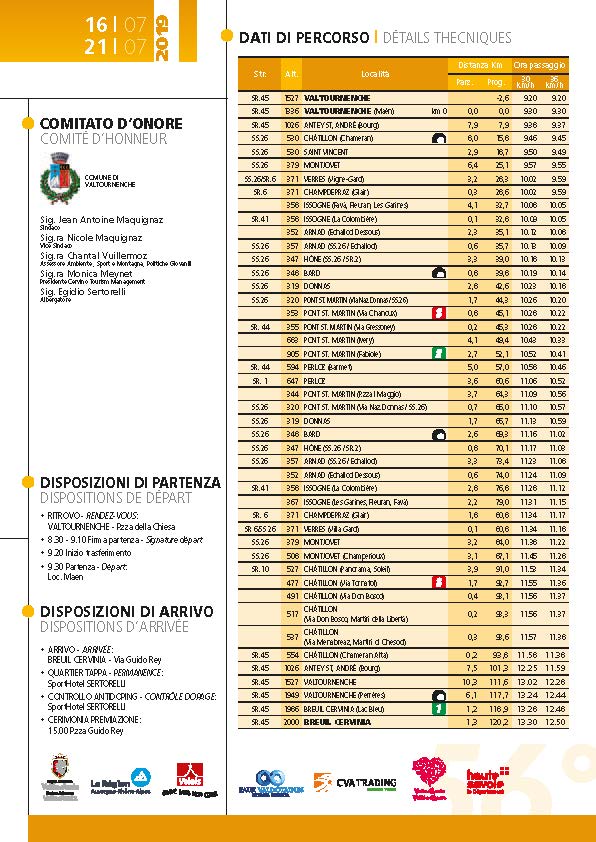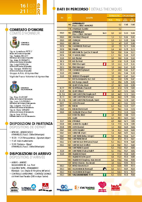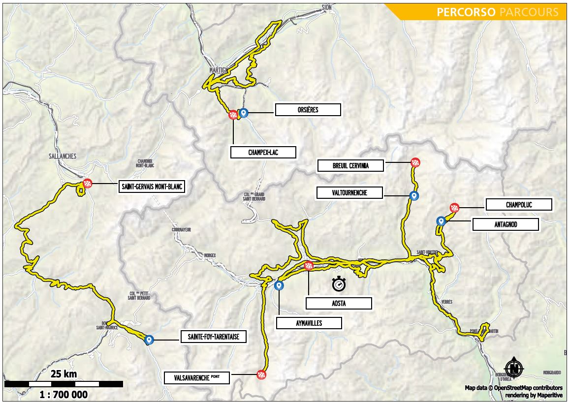 Si debutterà, martedì 16 luglio con il cronoprologo di Aosta, previsto su un circuito cittadino di circa 3 chilometri, veloce e filante, con arrivo e partenza presso lo storico Arco d’Augusto.