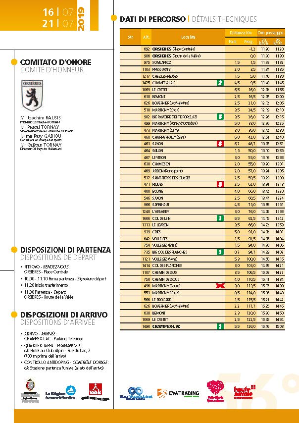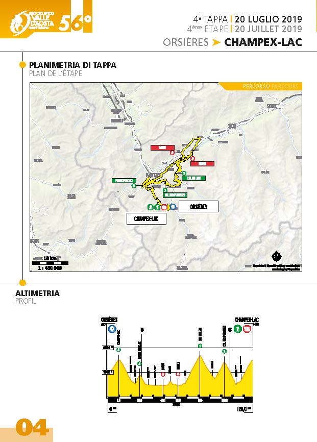 Sabato 20 luglio, sarà la volta della Svizzera con la Orsières – Champex. Le salite non mancheranno con la Petite Forclaz (ascesa che farà parte del circuito dei Campionati del Mondo di Ciclismo di Martigny nel 2020), il Col de Lein, il Col Des Planches e la severa erta finale sino al traguardo di Champex Lac.