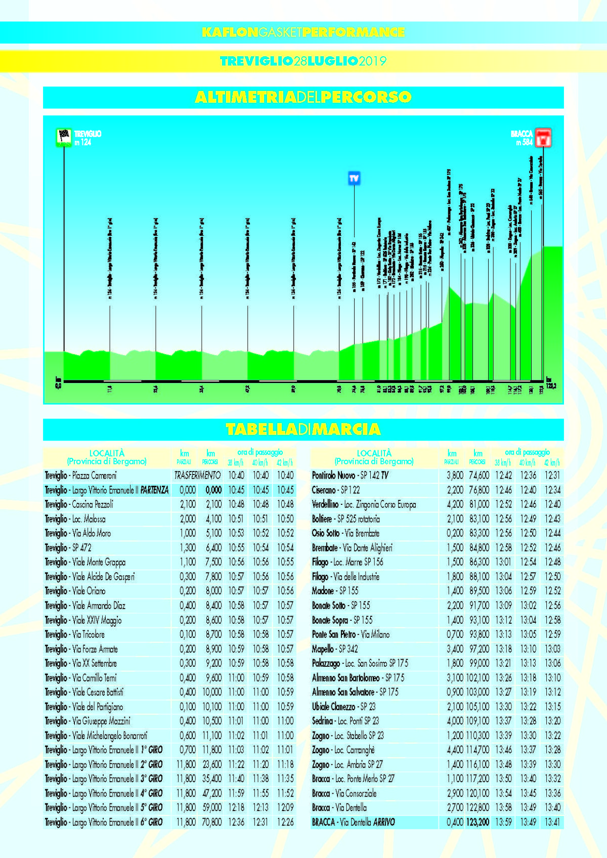La gara propone sei giri iniziali di un circuito cittadino a Treviglio, prima di andare ad affrontare il tratto in linea che condurrà verso la Valle Brembana e quindi l’arrivo a Bracca, in via Dentella (partenza alle 10,45 e arrivo previsto intorno alle 13,45).