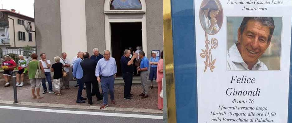 I funerali verranno celebrati domani mattina alle 11 dal parroco di Paladina don Vittorio Rossi e monsignor Mansueto Callioni, parroco di Almè e guida spirituale della famiglia Gimondi. La piazza antistante alla chiesa di Paladina sarà chiusa dalle 8 di martedì 20 agosto: sono attese circa duemila persone. I funerali saranno trasmessi in diretta su RaiSport a partire dalle ore 10.40.