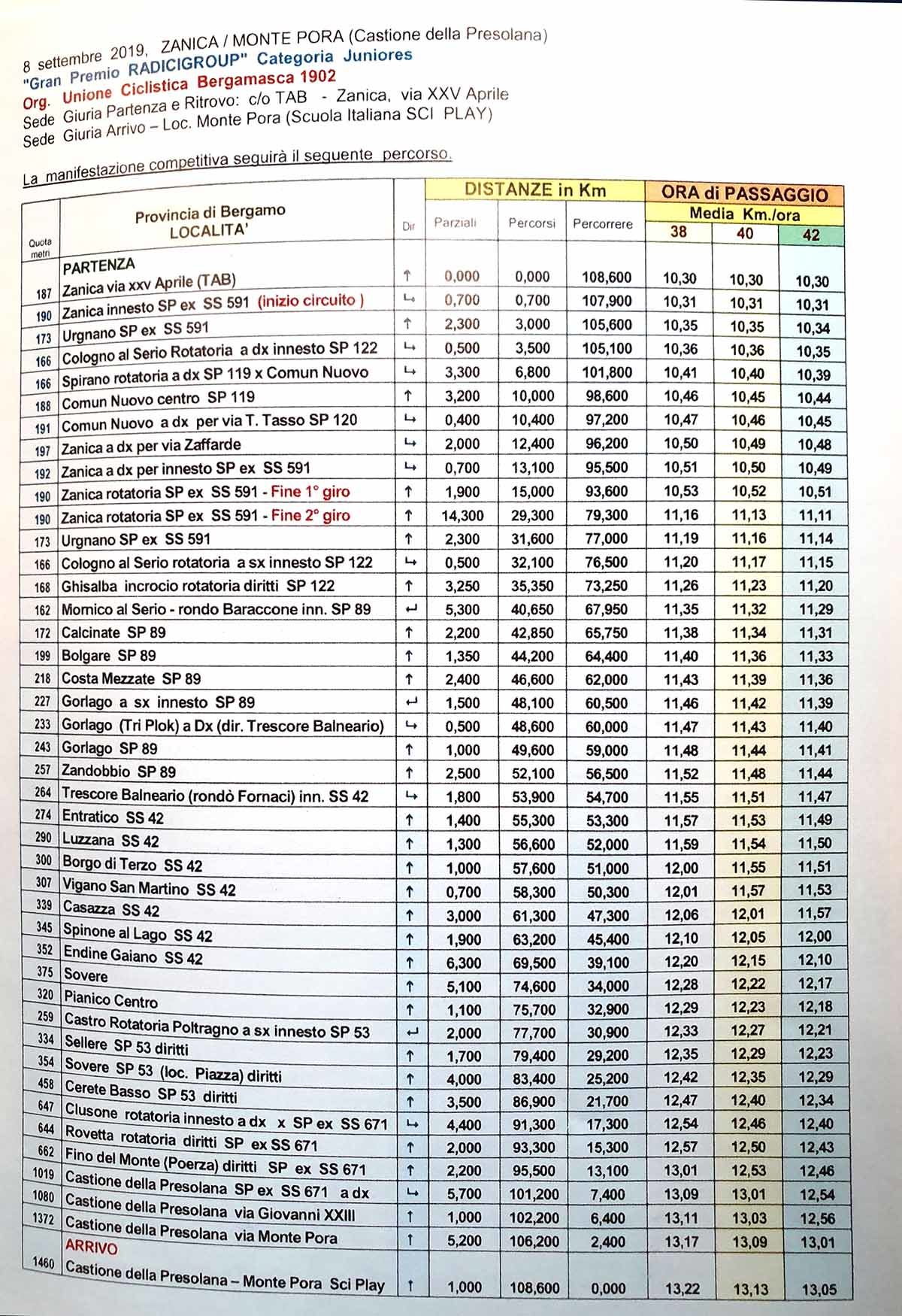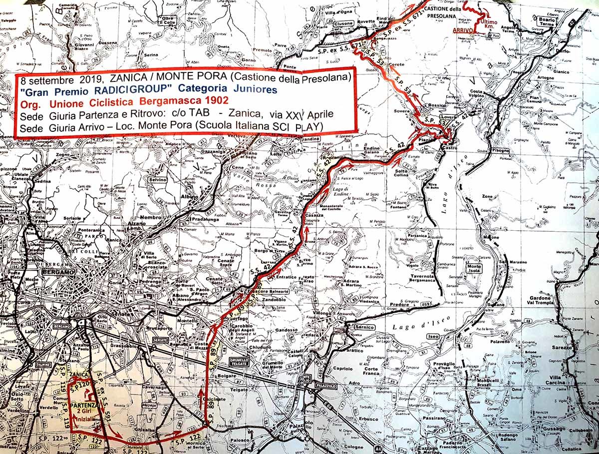 Descrizione – Gara in linea: partenza da Zanica in Via XXV Aprile ( TAB) – inizio circuito da ripetere due volte Urgnano SP ex SS591 Cologno al Serio Rotatoria a dx innest S.P. 122 Spirano Comun Nuovo Zanica Zanica rotatoria SP ex SS 591 – FINE PRIMO GIRO Zanica rotatoria SP ex SS591 FINE SECONDO GIRO Urgnano Cologno al Serio Ghisalba incrocio rotatoria diritti SP122 Mornico al Serio , rondo Baraccone innesto SP89 Calcinate SP89 Bolgare SP89 Costa di Mezzate Gorlago a dx direzione trescore B Gorlago SP89 Zandobbio Trescore Balneario (rondò Fornaci ) Entratico SS42 Luzzana SS42 Borgo di Terzo SS42 Vigano San Martino SS42 Casazza SS42 Spinone al Lago SS42 Endine Gaiano Sovere Pianico Centro Rotatorio Bivio Poltragno a sx innesto SP 53 Sellere SP53 diritti Sovere SP53 Cerete SP53 diritti Clusone rotatoria innesto a dx sp ex ss671 Rovetta Fino al Monte (Poerza ) Castione della Presolana Via Giovanni XXIII Via Monte Pora Vareno ( Angolo Terme ) Bs Castione della Presolana- Monte Pora – Piazzale Sci