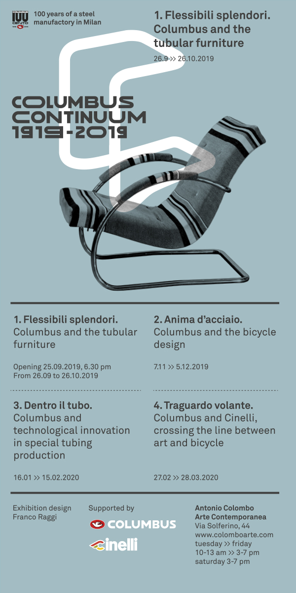 La prima mostra Flessibili Splendori: Columbus e il mobile in tubo metallico, curata da Alessandra Bassi e con il progetto di allestimento di Franco Raggi è dedicata alla produzione dei mobili in tubo metallico avviata dall’azienda A.L. Colombo nel 1933 e conclusasi nell’immediato dopoguerra. Tale produzione ha inizio quando viene acquisita la licenza esclusiva per la produzione in Italia dei mobili metallici dell’azienda zurighese Wohnbedarf, che aveva sviluppato modelli con molti architetti, come Alvar Aalto, Sigfried Giedion, Werner Moser, Alfred Roth o Flora Steiger, ma soprattutto con Marcel Breuer che dalla metà degli anni venti aveva progettato all’interno del Bauhaus con il tubolare d’acciaio.