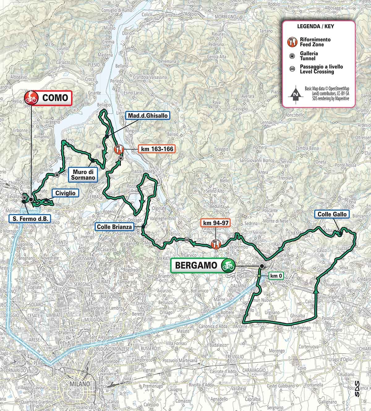Partenza da Bergamo in direzione sud attraversando nei primi 40 km la pianura bergamasca per risalire la val Cavallina fino a Casazza dove si affronta la prima salita della corsa il Colle Gallo. Colle seguito da una discesa veloce fino a rientrare dalla val Seriana su Bergamo. Ci si immette quindi nuovamente in strade di pianura che conducono in Brianza. Passaggio breve per Colle Brianza e discesa su Pescate per puntare su Valmadrera e poi in direzione Oggiono e, infine, attraverso Pusiano, Asso e la discesa su Onno portarsi a Bellagio dove inizia la salita del Ghisallo. Salita con pendenze fino al 14% su strada ampia con diversi tornanti. La discesa, molto veloce, si svolge per lunghi rettilinei e si interrompe a Maglio dove immediatamente dopo la svolta a destra inizia la salita della Colma di Sormano. Alcuni km di media pendenza e quindi poche centinaia di metri dopo Sormano si imbocca a sinistra il Muro di Sormano (2 km al 15%) su strada stretta, molto ripida, in parte all’interno di un boschetto, con tornanti strettissimi e con pendenze che attorno ai 1000 m di percorrenza superano il 25% fino a sfiorare il 30%. Superata la Colma segue la discesa su Nesso dove si riprende la strada costiera per raggiungere Como. Si affronta la dura salita verso Civiglio (614 m) con pendenze praticamente sempre attorno al 10% per ridiscendere e riattraversando Como superare l’ultima salita di San Fermo della Battaglia (m 397). Sono presenti due rifornimenti fissi: il primo a San Sosimo (km 112-115) e il secondo a Onno (km 182-185).