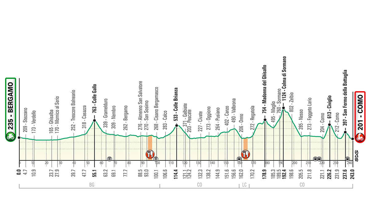 Partenza da Bergamo in direzione sud attraversando nei primi 40 km la pianura bergamasca per risalire la val Cavallina fino a Casazza dove si affronta la prima salita della corsa il Colle Gallo. Colle seguito da una discesa veloce fino a rientrare dalla val Seriana su Bergamo. Ci si immette quindi nuovamente in strade di pianura che conducono in Brianza. Passaggio breve per Colle Brianza e discesa su Pescate per puntare su Valmadrera e poi in direzione Oggiono e, infine, attraverso Pusiano, Asso e la discesa su Onno portarsi a Bellagio dove inizia la salita del Ghisallo. Salita con pendenze fino al 14% su strada ampia con diversi tornanti. La discesa, molto veloce, si svolge per lunghi rettilinei e si interrompe a Maglio dove immediatamente dopo la svolta a destra inizia la salita della Colma di Sormano. Alcuni km di media pendenza e quindi poche centinaia di metri dopo Sormano si imbocca a sinistra il Muro di Sormano (2 km al 15%) su strada stretta, molto ripida, in parte all’interno di un boschetto, con tornanti strettissimi e con pendenze che attorno ai 1000 m di percorrenza superano il 25% fino a sfiorare il 30%. Superata la Colma segue la discesa su Nesso dove si riprende la strada costiera per raggiungere Como. Si affronta la dura salita verso Civiglio (614 m) con pendenze praticamente sempre attorno al 10% per ridiscendere e riattraversando Como superare l’ultima salita di San Fermo della Battaglia (m 397). Sono presenti due rifornimenti fissi: il primo a San Sosimo (km 112-115) e il secondo a Onno (km 182-185).