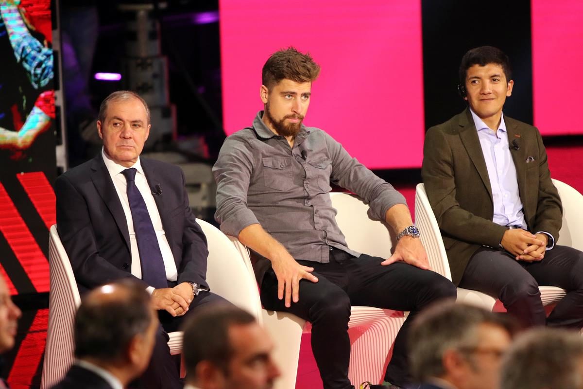 Il tre volte Campione del Mondo Peter Sagan ha dichiarato: “È bello essere oggi qui alla presentazione del percorso del Giro d’Italia 2020 e posso annunciare che sarò al via da Budapest. So che tanti miei connazionali verranno a seguire il Giro visto che la Slovacchia è molto vicina all’Ungheria. So anche che avrò tantissimi tifosi sulle strade italiane perchè in Italia mi allenavo e ci abitavo fino a qualche anno fa. Il Giro è una corsa molto importante e la prima parte del percorso è quella più adatta alle mie caratteristiche ma vorrei tener duro fino alla fine“.
