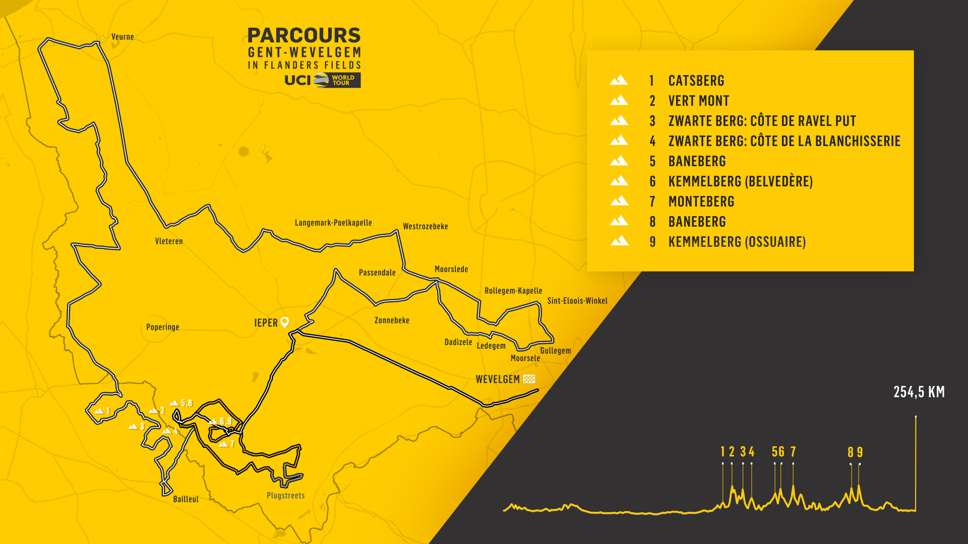 Durante gli 86 anni di storia della Gand-Wevelgem, il comune di Ypres è stato il partner più fedele all’organizzazione, con un passaggio nei chilometri di avvio e l’organizzazione mostra il suo apprezzamento portando la partenza nel suo territorio. La presentazione di team avrà luogo al Grote Markt di Ypres, la partenza ufficiosa dal Menin Gate. Da lì il gruppo raggiungerà il km zero posto al monumento al Soldato Meditabondo.