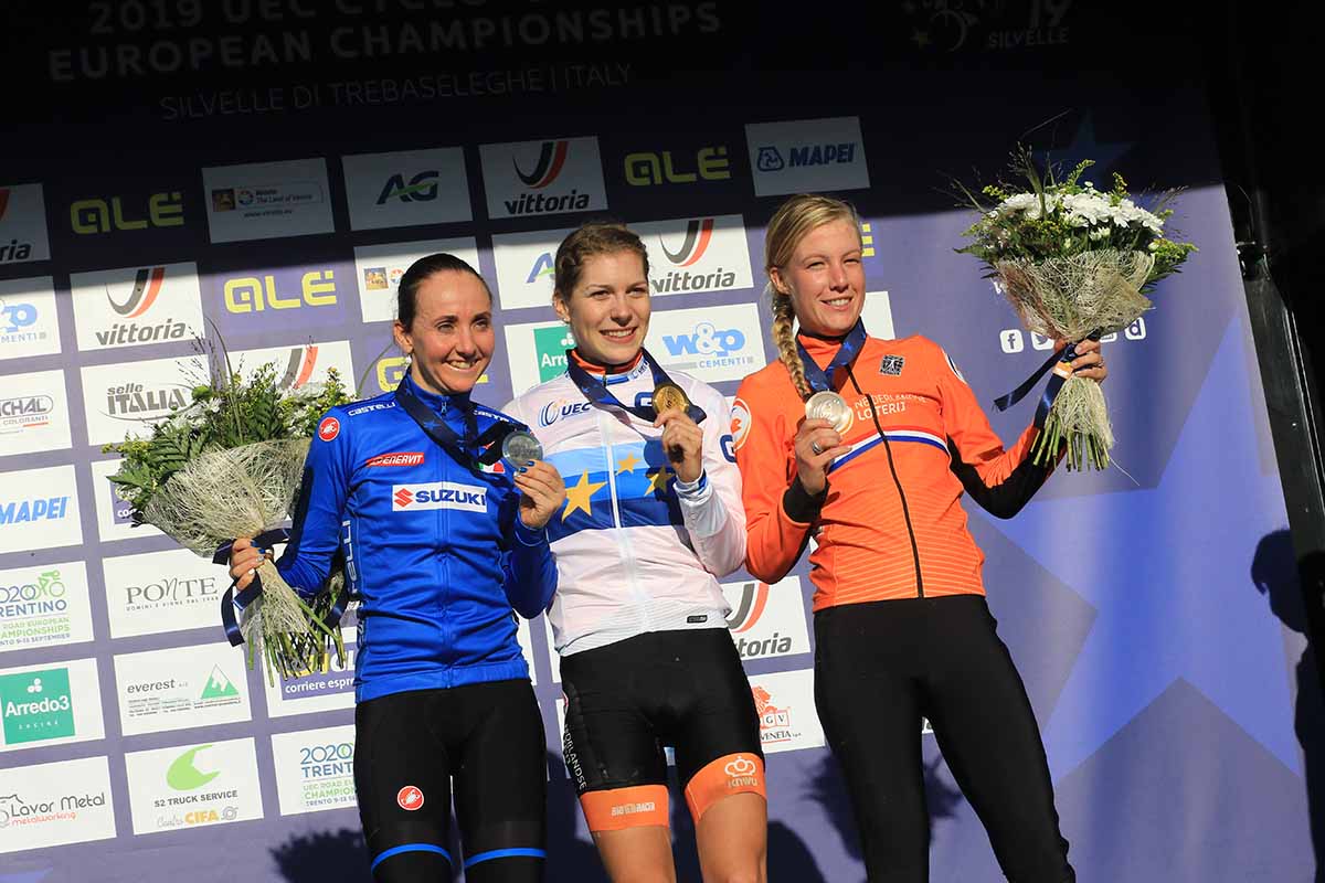 Fin dalle primissime pedalate la Kastelijn ha preso la testa della corsa che non ha più mollato, nonostante il finale tentativo di recupero della bolzanina Eva Lechner. L’italiana ha offerto un’ottima performance ed è andata a prendersi una bellissima medaglia d’argento (oro mancato di soli 12 secondi), regalando anche la prima medaglia all’Italia in questa rassegna continentale di casa. Medaglia di bronzo per l’altra olandese Annemerie Worts.