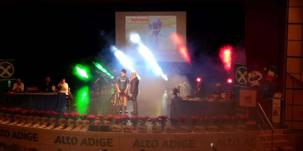 Dino Santi, con la consueta precisione ha regolato e illustrato una lunga premiazione, partita con le il tributo a Matteo Bianchi e proseguita con i riconoscimenti a cinque atleti per gli allori a livello continentale: Nils Laner del Bike Team Gais (campione europeo mtb team relay under 17, argento europeo Xce u17, tricolore Xco team relay per comitati, bronzo tricolore Xci allievi secondo anno, due titoli triveneti e due titoli di campione altoatesino nel ciclocross e nella mtb Xco allievi secondo anno), Noemi Plankensteiner del San Lorenzo (campionessa europea mtv Xco team relay under 17, tricolore Xce, tricolore Xco team relay per comitati, argento agli italiani Xco donne allieve secondo anno, due titoli triveneti e il titolo di campionessa provinciale Xco allieve secondo anno), l’esperta e mai doma Eva Lechner della Torpado Suedtirol Internazionale Mtb Pro Team (argento europeo nella mtc Xco team relay, tricolore ciclocross elite, argento tricolore Xco e bronzo Xce), Niclas Pallwebeer della Sunshine Racers Nalles (bronzo agli europeo Xce under 15, campione triveneto mtb Xco staffetta team relay) e Veronika Widmann del Bmx Team Alto Adige (oro in Coppa Europa, bronzo agli europei, agli italiani e in Coppa del Mondo di downhill).
