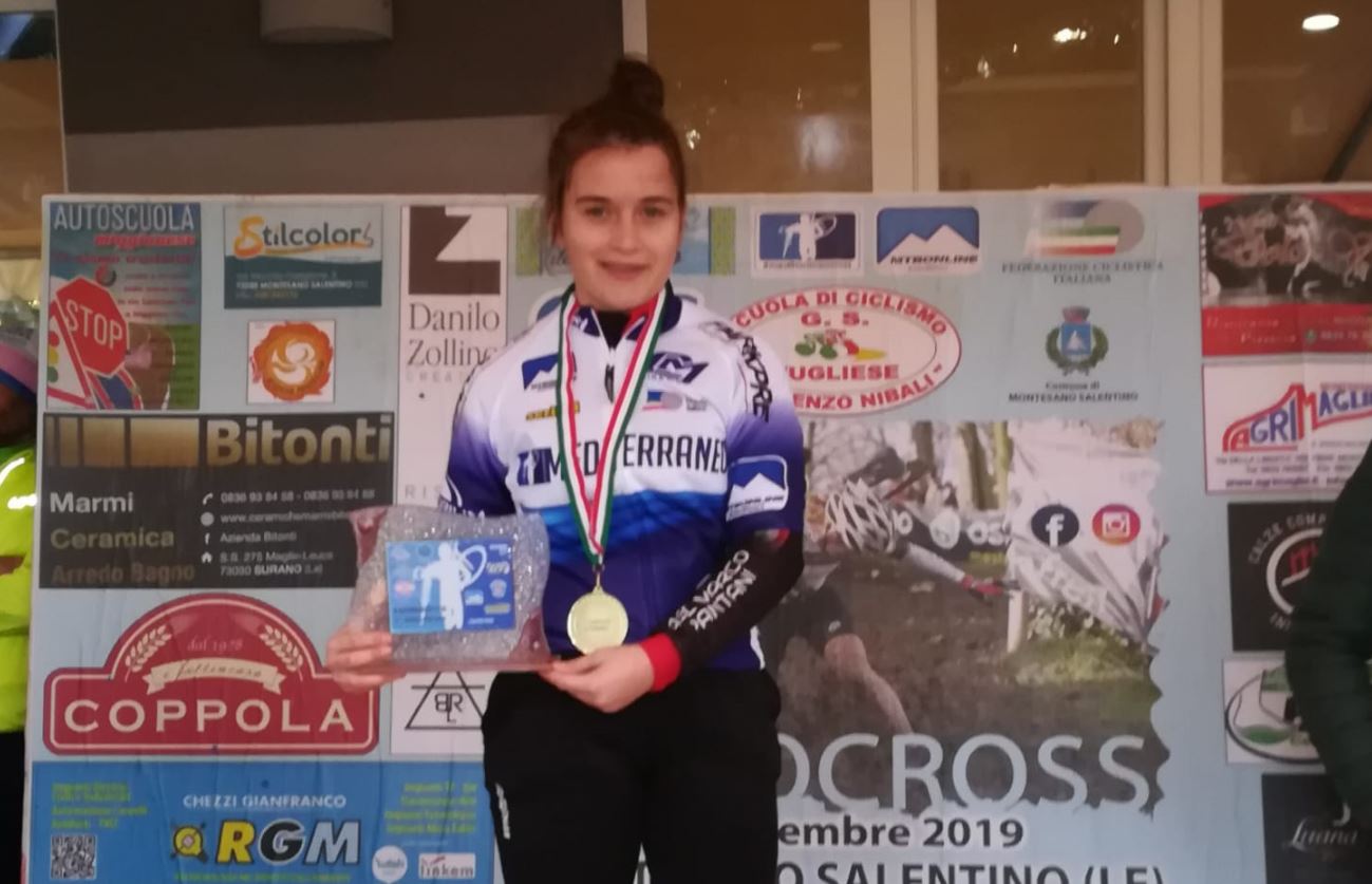 Uno sforzo non indifferente per la società di Montesano sulla Marcellana alla ribalta con l’unica esordiente in gara: Chiara Radesca (nella foto) è riuscita a competere con le più forti coetanee a livello nazionale partecipando al Giro d’Italia Ciclocross e chiudendo in bellezza con la vittoria finale nel circuito Mediterraneo Cross che si è aggiunta al campionato regionale FCI Campania su strada e alla partecipazione ai Campionati Italiani di Chianciano Terme nella rappresentativa regionale.