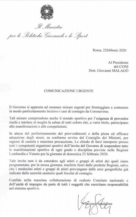 MILANO (MI) – Su indicazione del Governo, come annunciato ieri in conferenza stampa dal premier Giuseppe Conte, Il Ministro per le Politiche Giovanili e lo Sport Vincenzo Spadafora, ha chiesto al CONI di invitare le Federazione Sportive Nazionali, le Discipline Associate e gli Enti di Promozione Sportiva, a sospendere, per la giornata di domenica 23 febbraio, tutte le attività sportive in programma nelle Regioni di Lombardia e Veneto.