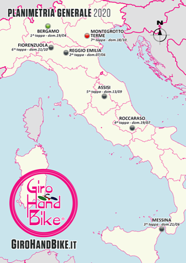 Sette tappe in sei regioni del Belpaese compresa un’isola, la Sicilia: da BERGAMO il 19 aprile a REGGIO EMILIA il 7 giugno; da MESSINA il 21 giugno a ROCCARASO il 19 luglio; da ASSISI il 13 settembre a FIORENZUOLA l’11 ottobre. Finalissima il 18 ottobre a MONTEGROTTO TERME. Dalla montagna al mare, dalla pianura alla collina; dalle bellezze naturali a quelle artistiche e storiche: ogni città tappa accoglie i #campionidivita offrendo la possibilità di manovellare tra i tesori d’Italia aggiudicandosi la maglia rosa TELEFLEX, la maglia nera PMP, la maglia bianca (miglior atleta giovane) G3 e la maglia rossa (fast team) SEO Solutions e Events organization. Al fianco del Giro Handbike anche gli altri sponsor Astoria, Rosti e Piazzalunga.