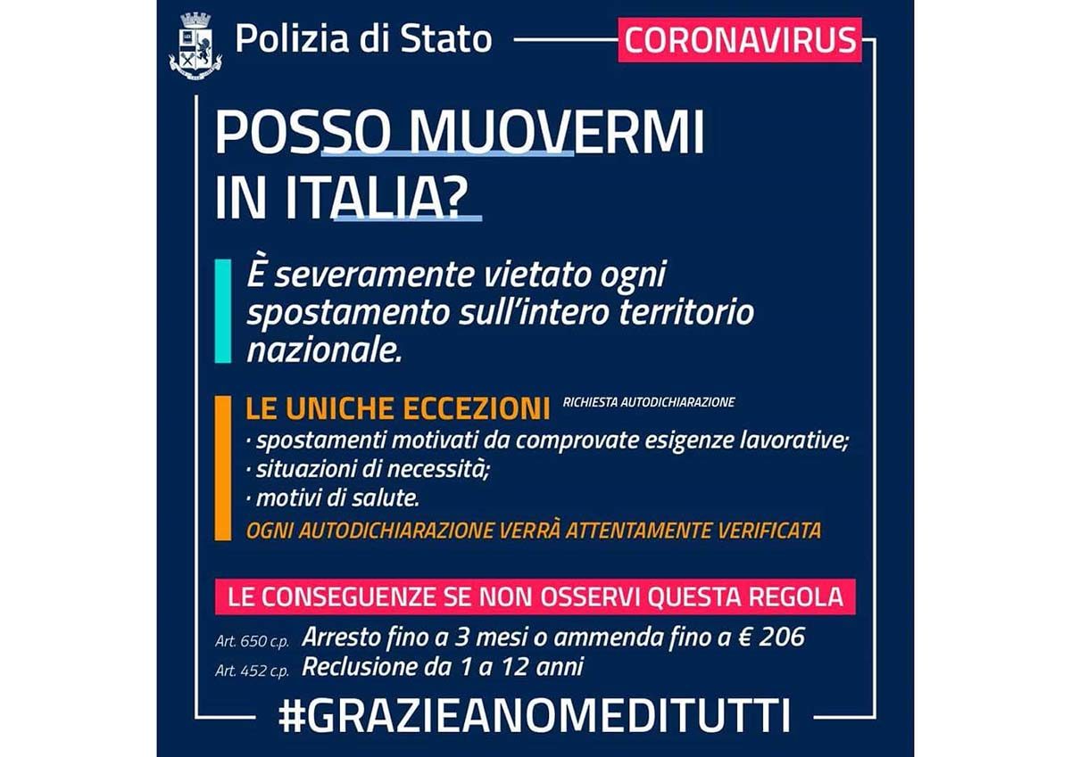Le conseguenze possono essere arresto fino a 3 mesi o ammenda fino a 206 Euro (Art. 650 c.p.) e reclusione da 1 a 12 anni (Art. 452 c.p.) quando si configurare un’ipotesi più grave, quale, ad esempio, un delitto colposo contro la salute pubblica. Potenzialmente anche uscire a piedi nel proprio paese, senza un motivo valido, potrebbe essere soggetto a verifica da parte delle forze dell’ordine. Ma è sempre al buon senso che ci appelliamo. Ognuno è responsabile delle proprie azioni, ma anche della salute degli altri.