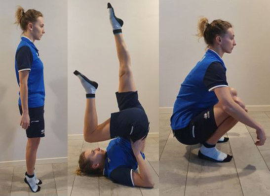 In piedi: assumere una posizione accosciata, portando i glutei vicini ai talloni. I talloni restano aderenti аl suolo ө lа schiena diritta. Gli arti inferiori estesi lungo il busto.