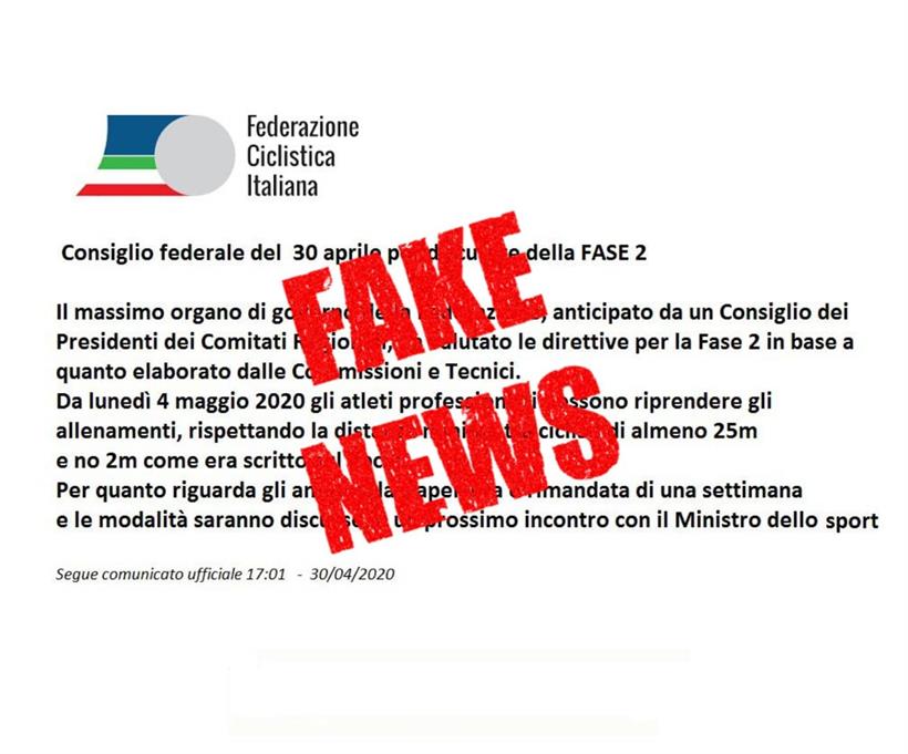 ROMA (RM) – Riguardo la notizia circolata in queste ore su diverse chat di Whatsapp a proposito di direttive per la ripresa dell’attività, la Federazione Ciclistica Italiana comunica che si tratta di una fake news e come tale del tutto priva di fondamento.